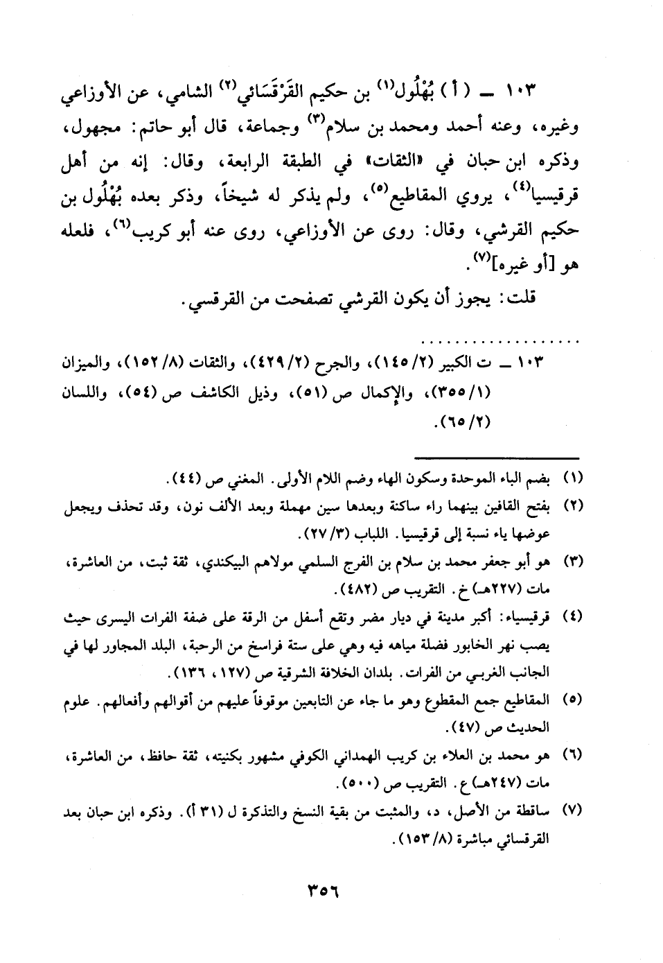 103 - ابهْلُول بن حَكِيم القرقسائي الشَّامي عَن الْأَوْزَاعِيّ وَغَيره وَعنهُ أَحْمد وَمُحَمّد بن سَلام وَجَمَاعَة قَالَ أَبُو حَاتِم مَجْهُول وَذكره بن حبَان فِي الثِّقَات فِي الطَّبَقَة الرَّابِعَة وَقَالَ انه من أهل قرقيسيا يرْوى المقاطيع وَلم يذكر لَهُ شَيخا وَذكر بعده بهْلُول بن حَكِيم الْقرشِي وَقَالَ روى عَن الْأَوْزَاعِيّ روى عَنهُ أَبُو كريب فَلَعَلَّهُ هُوَ أَو غَيره قلت يجوز ان يكون الْقرشِي تصحفت من القرقسي