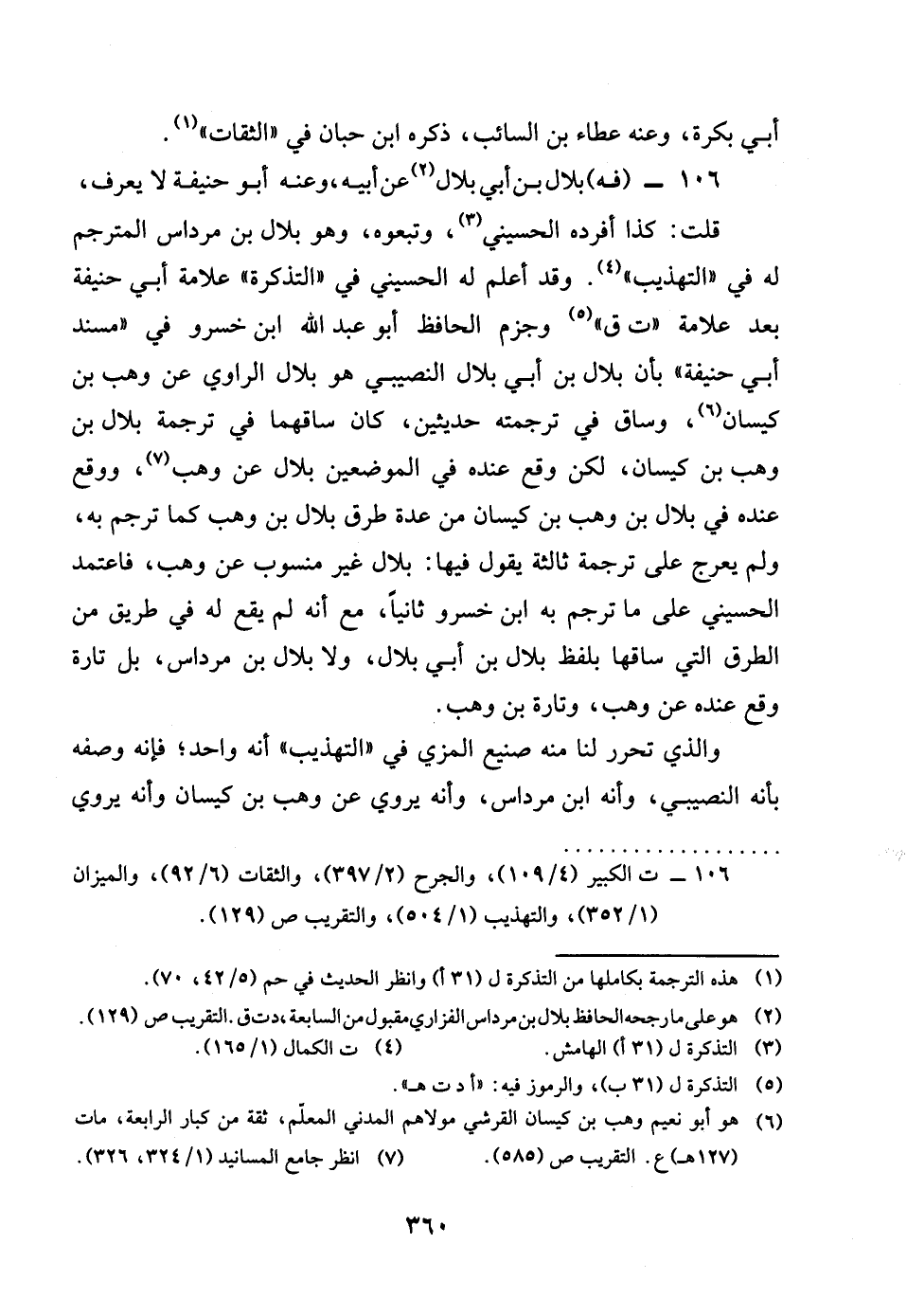 106 - فه بِلَال بن أبي بِلَال عَن أَبِيه وَعنهُ أَبُو حنيفَة لَا يعرف قلت كَذَا أفرده الْحُسَيْنِي وتبعوه وَهُوَ بِلَال بن مرداس المترجم لَهُ فِي التَّهْذِيب وَقد اعْلَم لَهُ الْحُسَيْنِي فِي التَّذْكِرَة عَلامَة أبي حنيفَة بعد عَلامَة ت ق وَجزم الْحَافِظ أَبُو عبد الله بن خسرو فِي مُسْند أبي حنيفَة بَان بِلَال بن أبي بِلَال النصيبي هُوَ بِلَال الرَّاوِي عَن وهب بن كيسَان وسَاق فِي تَرْجَمته حديثين كَانَ ساقهما فِي تَرْجَمَة بِلَال بن وهب بن كيسَان لَكِن وَقع عِنْده فِي الْمَوْضِعَيْنِ بِلَال عَن وهب وَوَقع عِنْده فِي بِلَال بن وهب بن كيسَان من عدَّة طرق بِلَال بن وهب كَمَا ترْجم بِهِ وَلم يعرج على تَرْجَمَة ثَالِثَة يَقُول فِيهَا بِلَال غير مَنْسُوب عَن وهب فاعتمد الْحُسَيْنِي على مَا ترْجم بِهِ بن خسرو ثَانِيًا مَعَ انه لم يَقع لَهُ فِي طَرِيق من الطّرق الَّتِي سَاقهَا بِلَفْظ بِلَال بن أبي بِلَال وَلَا بِلَال بن مرداس بل تَارَة وَقع عِنْده عَن وهب وَتارَة بن وهب وَكَذَا رَوَاهُ أَبُو بكر الْأَبْهَرِيّ عَن بن عرُوبَة ثَنَا حدير ثَنَا مُحَمَّد بن الْحسن وَلم يذكر الْمزي لوهب بن كيسَان ولدا يُسمى بِلَالًا وَقد اورد الحَدِيث بن خسرو من طَرِيق مُحَمَّد بن يحيى عَن الْحُسَيْن وَعَن أبي حنيفَة عَن بِلَال عَن وهب وَالَّذِي تحرر لنا مِنْهُ صَنِيع الْمزي فِي التَّهْذِيب انه وَاحِد فَإِنَّهُ وَصفه بِأَنَّهُ النصيبي وانه بن مرداس وانه يرْوى عَن وهب بن كيسَان وانه يرْوى