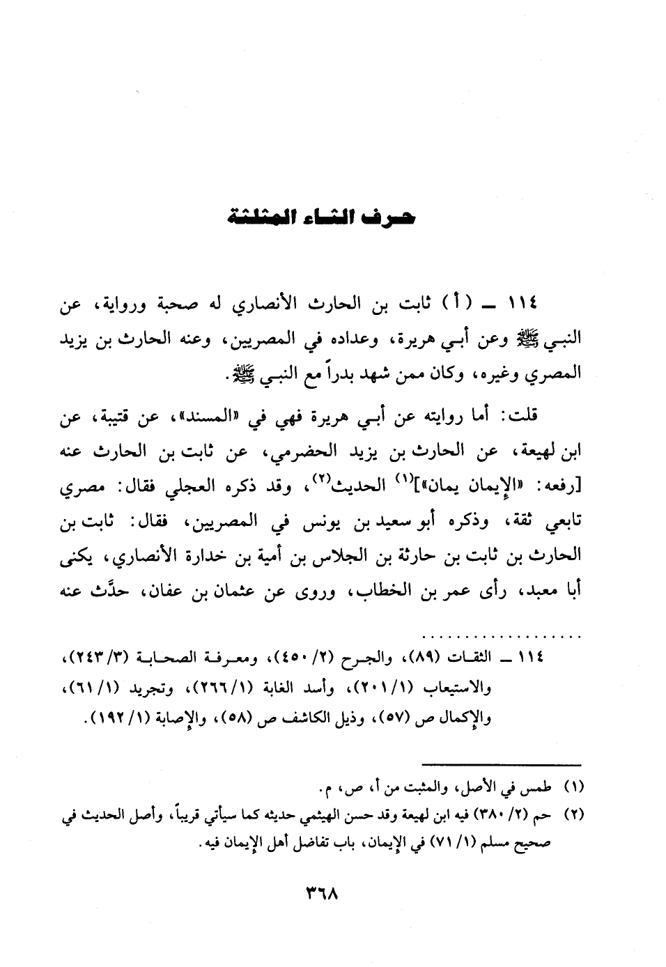 114 - اثَابت بن الْحَارِث الْأنْصَارِيّ لَهُ صُحْبَة وَرِوَايَة عَن النَّبِي صلى الله عَلَيْهِ وَسلم وَعَن أبي هُرَيْرَة وعداده فِي المصريين وَعنهُ الْحَارِث بن يزِيد الْمصْرِيّ وَغَيره وَكَانَ مِمَّن شهد بَدْرًا مَعَ النَّبِي صلى الله عَلَيْهِ وَسلم قلت اما رِوَايَته عَن أبي هُرَيْرَة فَهِيَ فِي الْمسند عَن قُتَيْبَة عَن بن لَهِيعَة عَن الْحَارِث بن يزِيد الْحَضْرَمِيّ عَن ثَابت بن الْحَارِث عَنهُ رَفعه الْإِيمَان يمَان الحَدِيث وَقد ذكره الْعجلِيّ فَقَالَ مصري تَابِعِيّ ثِقَة وَذكره أَبُو سعيد بن يُونُس فِي المصريين فَقَالَ ثَابت بن الْحَارِث بن ثَابت بن حَارِثَة بن الْجلاس بن أُميَّة بن خدارة الْأنْصَارِيّ يكنى أَبَا معبد رأى عمر بن الْخطاب وروى عَن عُثْمَان بن عَفَّان حدث عَنهُ