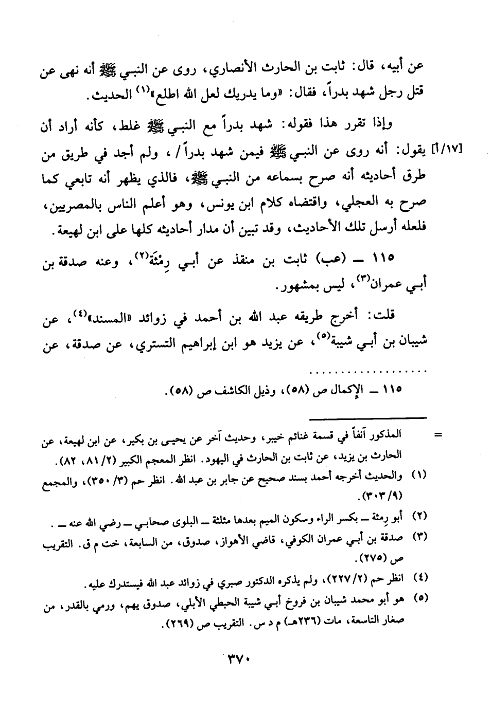 115 - عب ثَابت بن منقذ عَن أبي رمثة وَعنهُ صَدَقَة بن أبي عمرَان لَيْسَ بِمَشْهُور قلت اخْرُج طَرِيقه عبد الله بن أَحْمد فِي زَوَائِد الْمسند عَن شَيبَان بن أبي شيبَة عَن يزِيد هُوَ بن إِبْرَاهِيم التسترِي عَن صَدَقَة عَن