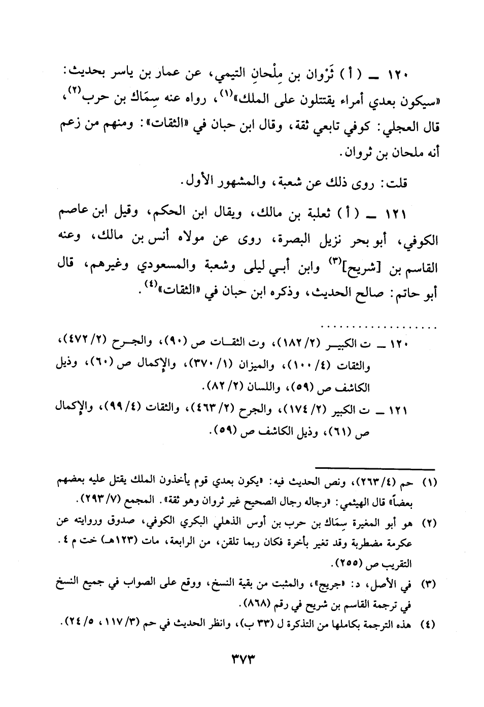 120 - اثروان بن ملْحَان التَّيْمِيّ عَن عمار بن يَاسر بِحَدِيث سَيكون بعدِي امراء يقتتلون على الْملك رَوَاهُ عَنهُ سماك بن حَرْب قَالَ الْعجلِيّ كُوفِي تَابِعِيّ ثِقَة وَقَالَ بن حبَان فِي الثِّقَات وَمِنْهُم من زعم انه ملْحَان بن ثروان قلت روى ذَلِك عَن شُعْبَة وَالْمَشْهُور الأول وَالصَّوَاب الأول وَقَالَ الْعجلِيّ كُوفِي تَابِعِيّ ثِقَة