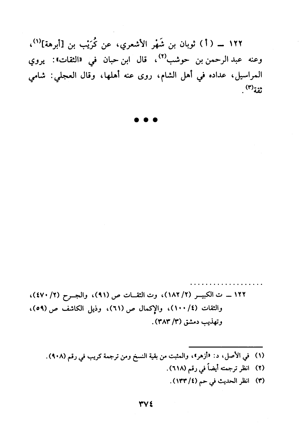 122 - اثَوْبَان بن شهر الْأَشْعَرِيّ عَن كريب بن أَبْرَهَة وَعنهُ عبد الرَّحْمَن بن حَوْشَب قَالَ بن حبَان فِي الثِّقَات يروي الْمَرَاسِيل عداده فِي أهل الشَّام روى عَنهُ أَهلهَا وَقَالَ الْعجلِيّ شَامي ثِقَة