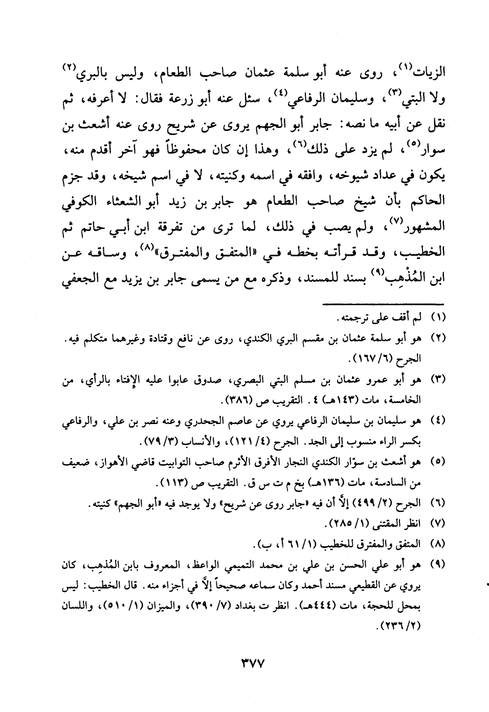 الزيات روى عَنهُ أَبُو سَلمَة عُثْمَان صَاحب الطَّعَام وَلَيْسَ بالبري وَلَا بالبتي وَسليمَان الرِّفَاعِي سُئِلَ عَنهُ أَبُو زرْعَة فَقَالَ لَا اعرفه ثمَّ نقل عَن أَبِيه مَا نَصه جَابر أَبُو الجهم يرْوى عَن شُرَيْح روى عَنهُ أَشْعَث بن سوار لم يزدْ على ذَلِك وَهَذَا ان كَانَ مَحْفُوظًا فَهُوَ آخر اقدم مِنْهُ يكون فِي عداد شُيُوخه وَافقه فِي اسْمه وكنيته لَا فِي اسْم شَيْخه وَقد جزم الْحَاكِم بَان شيخ صَاحب الطَّعَام هُوَ أَبُو الشعْثَاء جَابر بن زيد أَبُو الشعْثَاء الْكُوفِي الْمَشْهُور وَلم يصب فِي ذَلِك لما ترى من تَفْرِقَة بن أبي حَاتِم ثمَّ الْخَطِيب وَقد قرأته بِخَطِّهِ فِي الْمُتَّفق والمفترق وَسَاقه عَن بن الْمَذْهَب بِسَنَد للمسند وَذكره مَعَ من يُسمى جَابر بن يزِيد مَعَ الْجعْفِيّ