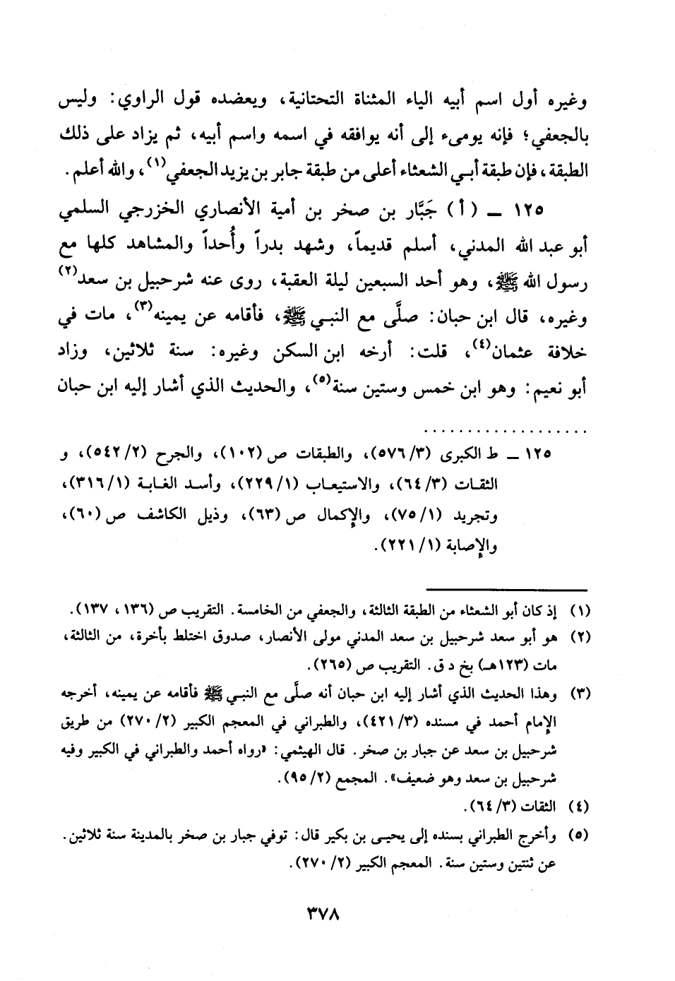 125 - اجَبَّار بن صَخْر بن أُميَّة الْأنْصَارِيّ الخزرجي السّلمِيّ أَبُو عبد الله الْمدنِي اسْلَمْ قَدِيما وَشهد بَدْرًا وأحدا والمشاهد كلهَا مَعَ رَسُول الله صلى الله عَلَيْهِ وَسلم وَهُوَ أحد السّبْعين لَيْلَة الْعقبَة روى عَنهُ شُرَحْبِيل بن سعد وَغَيره قَالَ بن حبَان صلى مَعَ النَّبِي صلى الله عَلَيْهِ وَسلم فاقامه عَن يَمِينه مَاتَ فِي خلَافَة عُثْمَان قلت أرخه بن السكن وَغَيره سنة ثَلَاثِينَ وَزَاد أَبُو نعيم وَهُوَ بن خمس وَسِتِّينَ سنة والْحَدِيث الَّذِي أَشَارَ اليه بن حبَان