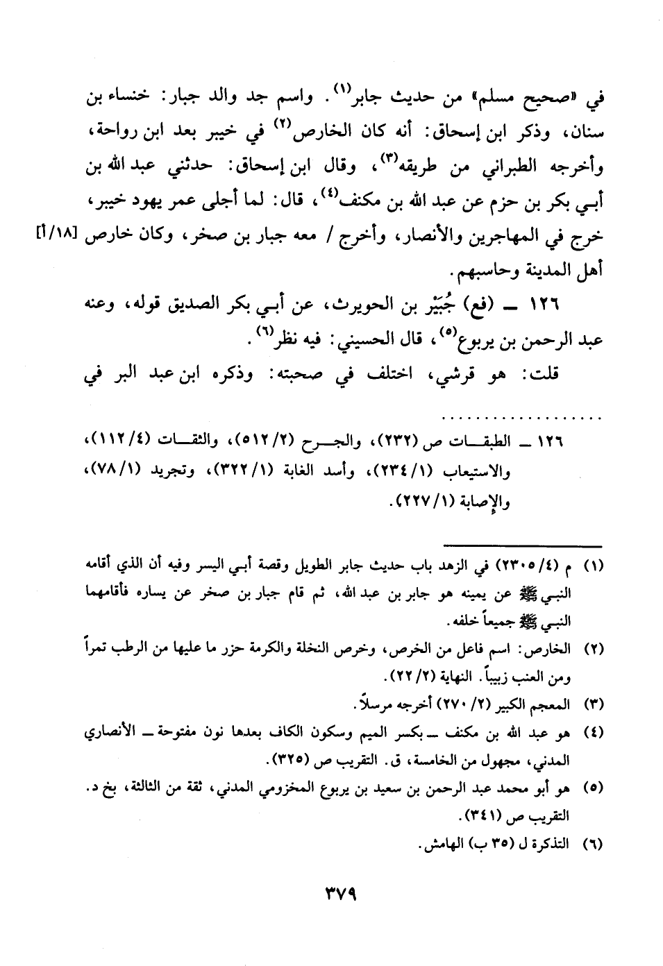 126 - فع جُبَير بن الْحُوَيْرِث عَن أبي بكر الصّديق قَوْله وَعنهُ عبد الرَّحْمَن بن يَرْبُوع قَالَ الْحُسَيْنِي فِيهِ نظر قلت هُوَ قرشي اخْتلف فِي صحبته وَذكره بن عبد الْبر فِي