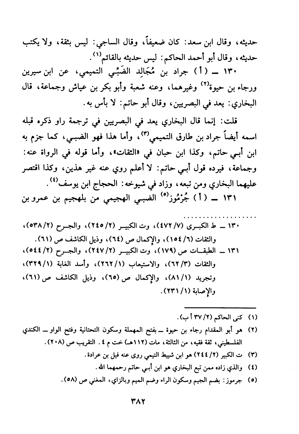130 - اجَراد بن مجَالد الضَّبِّيّ التَّمِيمِي عَن بن سِيرِين ورجاء بن حَيْوَة وَغَيرهمَا وَعنهُ شُعْبَة وَأَبُو بكر بن عَيَّاش وَجَمَاعَة قَالَ البُخَارِيّ يعد فِي الْبَصرِيين وَقَالَ أَبُو حَاتِم لَا بَأْس بِهِ قلت إِنَّمَا قَالَ البُخَارِيّ يعد فِي الْبَصرِيين فِي تَرْجَمَة رَاوِي ذكره قبله اسْمه أَيْضا جَراد بن طَارق التَّمِيمِي واما هَذَا فَهُوَ الضَّبِّيّ كَمَا جزم بِهِ بن أبي حَاتِم وَكَذَا بن حبَان فِي الثِّقَات واما قَوْله فِي الروَاة عَنهُ وَجَمَاعَة فَيردهُ قَول أبي حَاتِم لَا اعْلَم روى عَنهُ غير هذَيْن وَكَذَا اقْتصر عَلَيْهِمَا البُخَارِيّ وَمن تبعه وَزَاد فِي شُيُوخه الْحجَّاج بن يُوسُف
