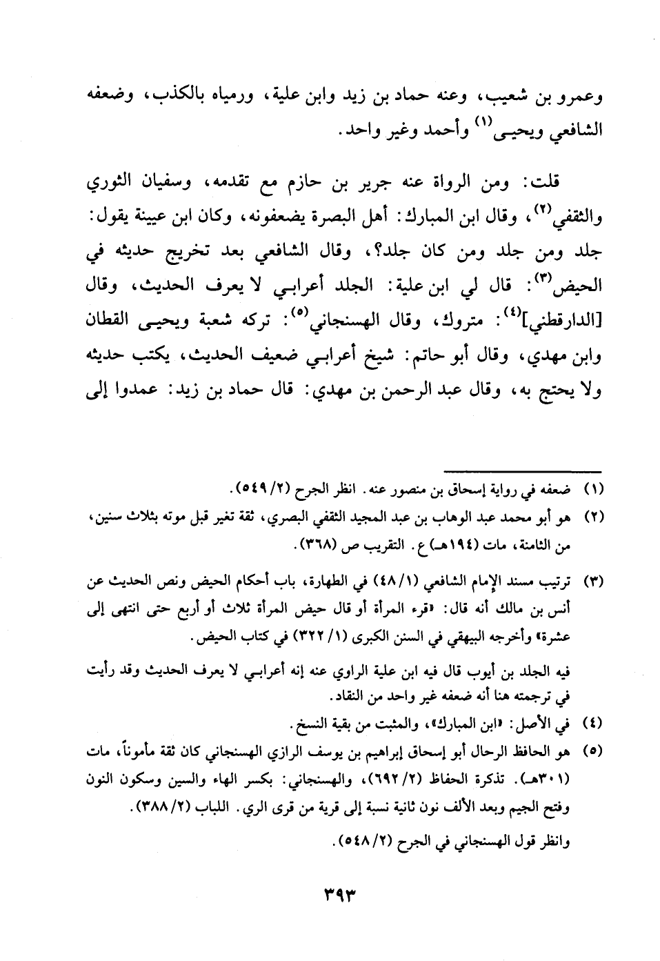 وَعَمْرو بن شُعَيْب وَعنهُ حَمَّاد بن زيد وَابْن علية ورمياه بِالْكَذِبِ وَضَعفه الشَّافِعِي وَيحيى وَأحمد وَغير وَاحِد قلت وَمن الروَاة عَنهُ جرير بن حَازِم مَعَ تقدمه وسُفْيَان الثَّوْريّ والثقفي وَقَالَ بن الْمُبَارك أهل الْبَصْرَة يضعفونه وَكَانَ بن عُيَيْنَة يَقُول جلد وَمن جلد وَمن كَانَ جلد وَقَالَ الشَّافِعِي بعد تَخْرِيج حَدِيثه فِي الْحيض قَالَ لي بن علية الْجلد أَعْرَابِي لَا يعرف الحَدِيث وَقَالَ الدَّارَقُطْنِيّ مَتْرُوك وَقَالَ الهسنجاني تَركه شُعْبَة وَيحيى وَالْقطَّان وَابْن مهْدي قَالَ وَأَبُو حَاتِم شيخ أَعْرَابِي ضَعِيف الحَدِيث يكْتب حَدِيثه وَلَا يحْتَج بِهِ وَقَالَ عبد الرَّحْمَن بن مهْدي قَالَ حَمَّاد بن زيد عَمدُوا الى