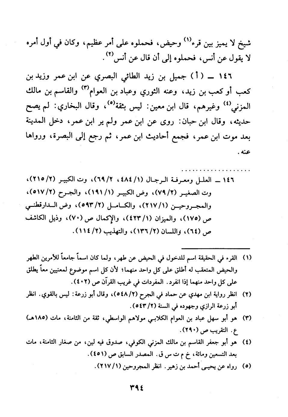 146- اجميل بن زيد الطَّائِي الْبَصْرِيّ عَن بن عمر وَزيد بن كَعْب أَو كَعْب بن زيد وَعنهُ الثَّوْريّ وَعباد بن الْعَوام وَالقَاسِم بن مَالك الْمُزنِيّ وَغَيرهم قَالَ بن معِين لَيْسَ بِثِقَة وَقَالَ البُخَارِيّ لم يَصح حَدِيثه وَقَالَ بن حبَان روى عَن بن عمر وَلم ير بن عمر دخل الْمَدِينَة بعد موت بن عمر فَجمع أَحَادِيث بن عمر ثمَّ رَجَعَ الى الْبَصْرَة وَرَوَاهَا