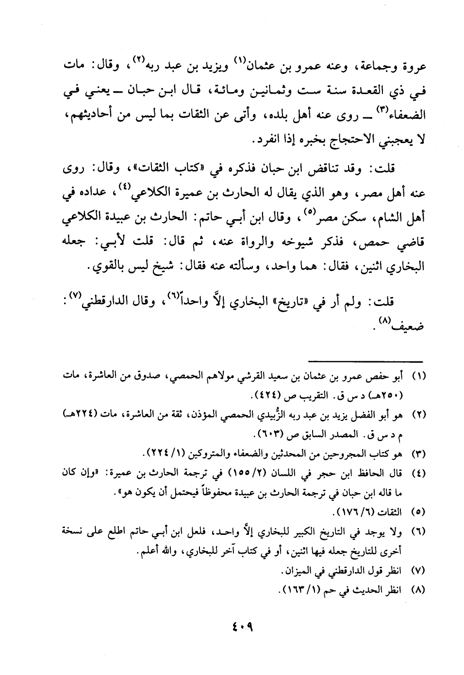 عُرْوَة وَجَمَاعَة وَعنهُ عَمْرو بن عُثْمَان وَيزِيد بن عبد ربه وَقَالَ مَاتَ فِي ذِي الْقعدَة سنة سِتّ وَثَمَانِينَ وَمِائَة قَالَ بن حبَان يَعْنِي فِي الضُّعَفَاء روى عَنهُ أهل بَلَده واتى عَن الثِّقَات بِمَا لَيْسَ من أَحَادِيثهم لَا يُعجبنِي الِاحْتِجَاج بِخَبَرِهِ إِذا انْفَرد قلت وَقد تنَاقض بن حبَان فَذكره فِي كتاب الثِّقَات وَقَالَ روى عَنهُ أهل مصر وَهُوَ الَّذِي يُقَال لَهُ الْحَارِث بن عميرَة الكلَاعِي عداده فِي أهل الشَّام سكن مصر وَقَالَ بن أبي حَاتِم الْحَارِث بن عُبَيْدَة الكلَاعِي قَاضِي حمص فَذكر شُيُوخه والرواة عَنهُ ثمَّ قَالَ قلت لأبي جعله البُخَارِيّ اثْنَيْنِ فَقَالَ هما وَاحِد وَسَأَلته عَنهُ فَقَالَ شيخ لَيْسَ بِالْقَوِيّ قلت وَلم ار فِي تَارِيخ البُخَارِيّ الا وَاحِدًا وَقَالَ الدَّارَقُطْنِيّ ضَعِيف