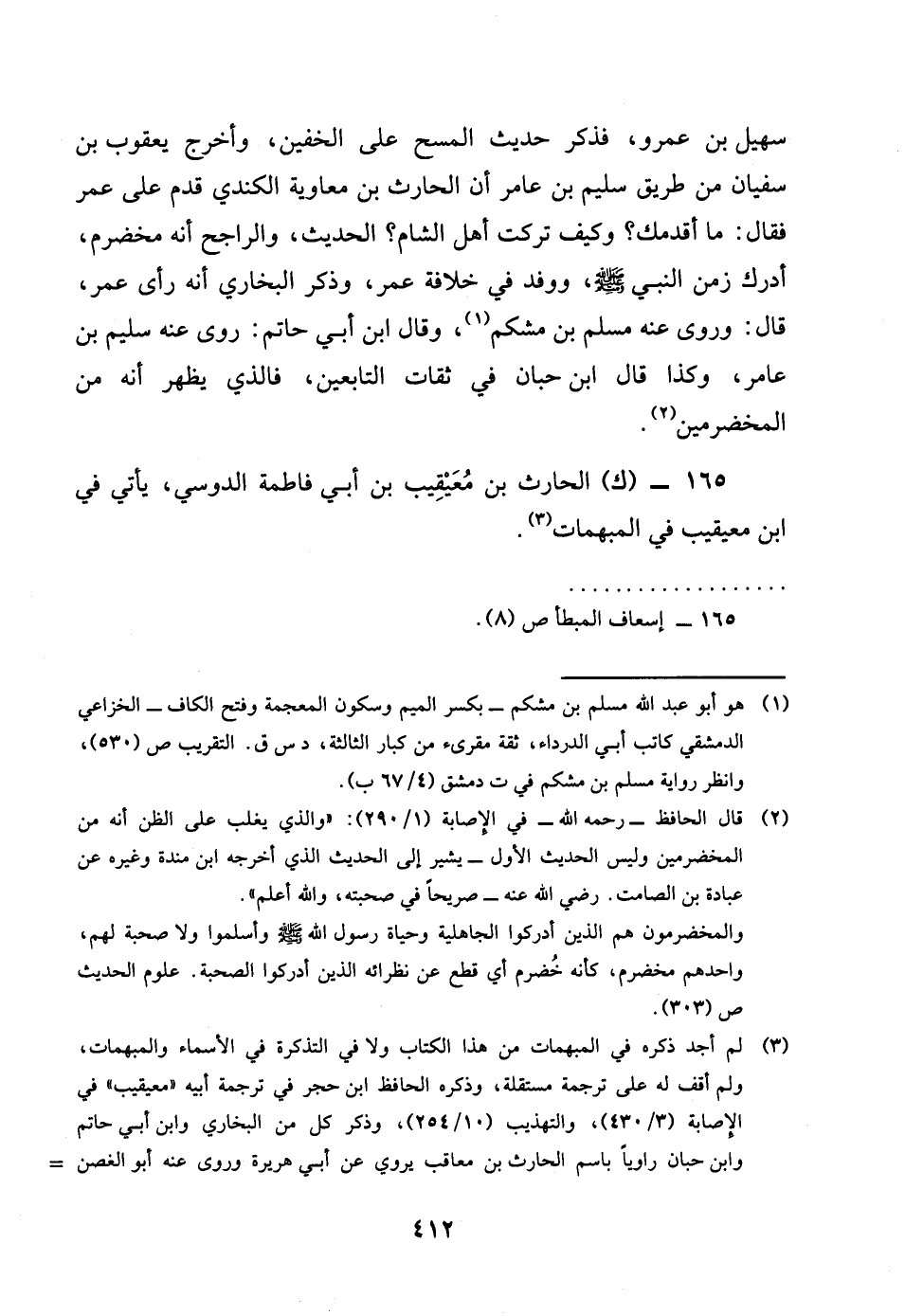 سُهَيْل بن عَمْرو فَذكر حَدِيث الْمسْح على الْخُفَّيْنِ واخرج يَعْقُوب بن سُفْيَان من طَرِيق سليم بن عَامر ان الْحَارِث بن مُعَاوِيَة الْكِنْدِيّ قدم على عمر فَقَالَ مَا اقدمك وَكَيف تركت أهل الشَّام الحَدِيث وَالرَّاجِح انه مخضرم أدْرك زمن النَّبِي صلى الله عَلَيْهِ وَسلم ووفد فِي خلَافَة عمر وَذكر البُخَارِيّ انه رأى عمر قَالَ وروى عَنهُ مُسلم بن مشْكم وَقَالَ بن أبي حَاتِم روى عَنهُ سليم بن عَامر وَكَذَا قَالَ بن حبَان فِي ثِقَات التَّابِعين وَالَّذِي يظْهر انه من المخضرمين