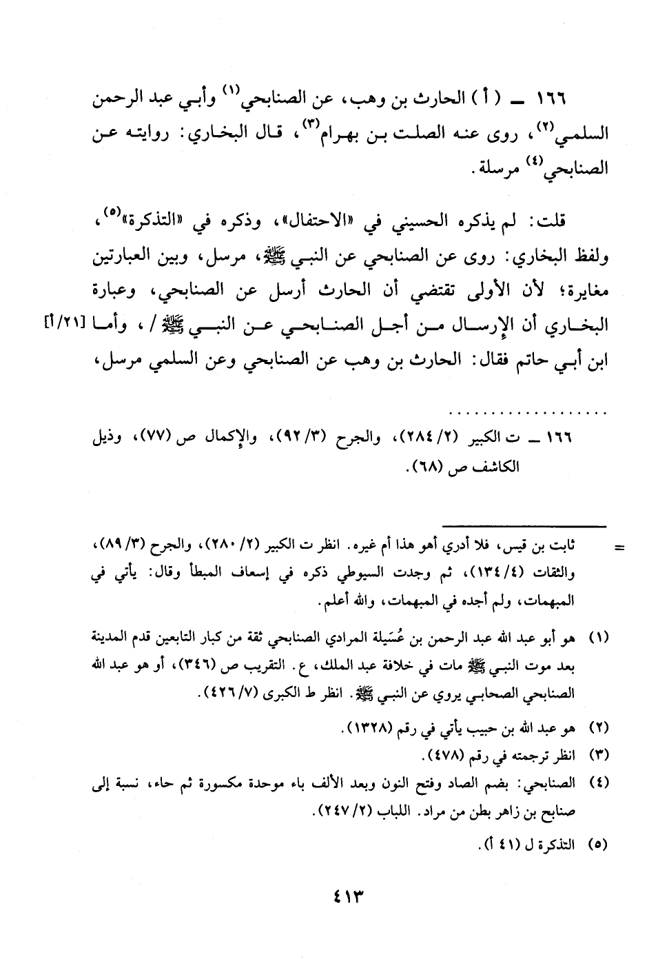 166 - االْحَارِث بن وهب عَن الصنَابحِي وَأبي عبد الرَّحْمَن السّلمِيّ روى عَنهُ الصَّلْت بن بهْرَام قَالَ البُخَارِيّ رِوَايَته عَن الصنَابحِي مُرْسلَة قلت لم يذكرهُ الْحُسَيْنِي فِي الاحتفال وَذكره فِي التَّذْكِرَة وَلَفظ البُخَارِيّ روى عَن الصنَابحِي عَن النَّبِي صلى الله عَلَيْهِ وَسلم مُرْسل وَبَين العبارتين مُغَايرَة لَان الأولى تَقْتَضِي ان الْحَارِث أرسل عَن الصنَابحِي وَعبارَة البُخَارِيّ ان الْإِرْسَال من أجل الصنَابحِي عَن النَّبِي صلى الله عَلَيْهِ وَسلم واما بن أبي حَاتِم فَقَالَ الْحَارِث بن وهب عَن الصنَابحِي وَعَن السّلمِيّ مُرْسل