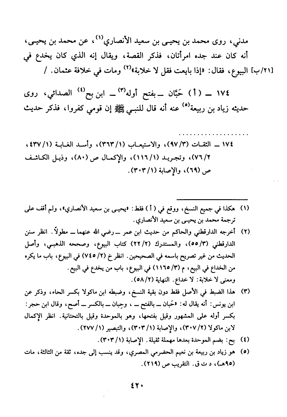 174 - احبَان بِفَتْح أَوله بن بح الصدائي روى حَدِيثه زِيَاد بن ربيعَة عَنهُ انه قَالَ للنَّبِي صلى الله عَلَيْهِ وَسلم ان قومِي كفرُوا فَذكر حَدِيث تفجر المَاء من بَين أَصَابِع النَّبِي صلى الله عَلَيْهِ وَسلم وَهُوَ فِي مُسْند الشاميين قَالَ الدَّارَقُطْنِيّ وَفد على رَسُول الله صلى الله عَلَيْهِ وَسلم وروى عَنهُ حَدِيثا وَشهد فتح مصر