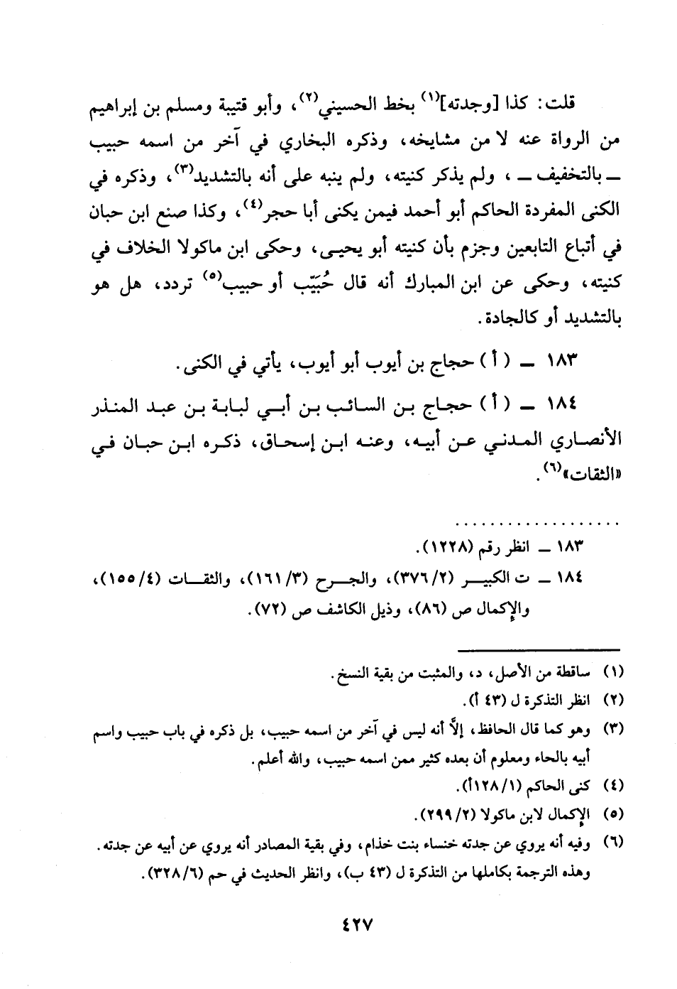 قلت كَذَا وجدته بِخَط الْحُسَيْنِي وَأَبُو قُتَيْبَة وَمُسلم بن إِبْرَاهِيم من الروَاة عَنهُ لَا من مشايخه وَذكره البُخَارِيّ فِي آخر من اسْمه حبيب بِالتَّخْفِيفِ وَلم يذكر كنيته وَلم يُنَبه على انه بِالتَّشْدِيدِ وَذكره فِي الكنى المفردة الْحَاكِم أَبُو أَحْمد فِيمَن يكنى أَبَا حجر وَكَذَا صنع بن حبَان فِي اتِّبَاع التَّابِعين وَجزم بَان كنيته أَبُو يحيى وَحكى بن مَاكُولَا الْخلاف فِي كنيته وَحكى عَن بن الْمُبَارك انه قَالَ حبيب أَو حبيب تردد هَل هُوَ بِالتَّشْدِيدِ أَو كالجادة