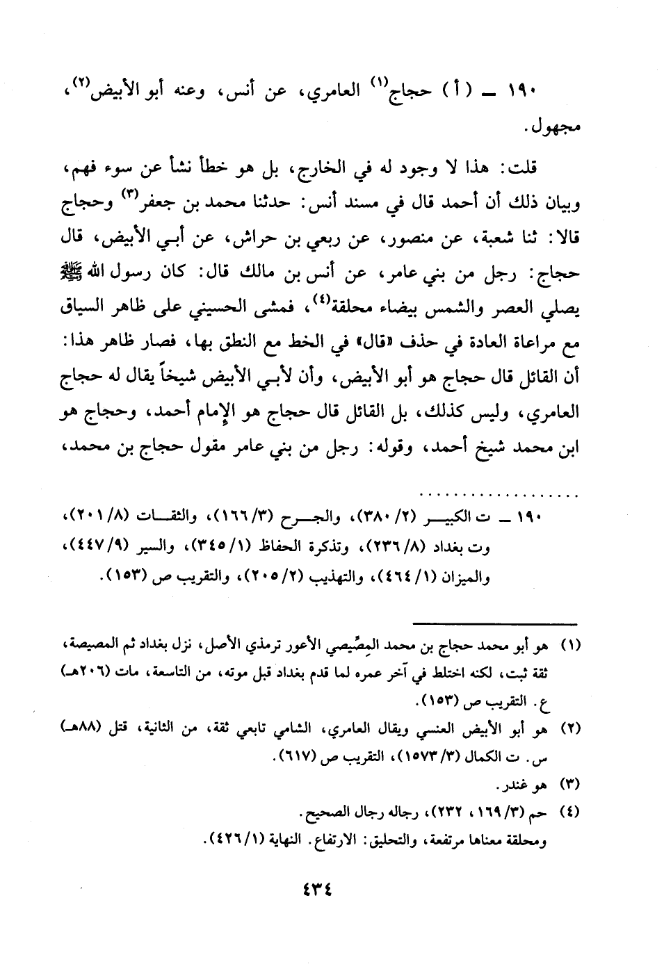 190 - احجاج العامري عَن أنس وَعنهُ أَبُو الْأَبْيَض مَجْهُول قلت هَذَا لَا وجود لَهُ فِي الْخَارِج بل هُوَ خطأ نَشأ عَن سوء فهم وَبَيَان ذَلِك ان أَحْمد قَالَ فِي مُسْند أنس حَدثنَا مُحَمَّد بن جَعْفَر وحجاج قَالَا حَدثنَا شُعْبَة عَن مَنْصُور عَن ربعي بن حِرَاش عَن أبي الْأَبْيَض قَالَ حجاج رجل من بنى عَامر عَن أنس بن مَالك قَالَ كَانَ رَسُول الله صلى الله عَلَيْهِ وَسلم يصلى الْعَصْر وَالشَّمْس بَيْضَاء محلقة فَمشى الْحُسَيْنِي على ظَاهر السِّيَاق مَعَ مُرَاعَاة الْعَادة فِي حذف قَالَ فِي الْخط مَعَ النُّطْق بهَا فَصَارَ ظَاهر هَذَا ان الْقَائِل قَالَ حجاج هُوَ أَبُو الْأَبْيَض وان لأبي الْأَبْيَض شَيخا يُقَال لَهُ حجاج العامري وَلَيْسَ كَذَلِك بل الْقَائِل قَالَ حجاج هُوَ الامام أَحْمد وحجاج هُوَ بن مُحَمَّد شيخ أَحْمد وَقَوله رجل من بنى عَامر مقول حجاج بن مُحَمَّد
