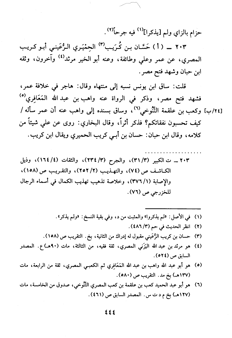 203- احسان بن كريب الْحِمْيَرِي الرعيني أَبُو كريب الْمصْرِيّ عَن عمر وَعلي وَطَائِفَة وَعنهُ أَبُو الْخَيْر مرْثَد وَآخَرُونَ وَثَّقَهُ بن حبَان وَشهد فتح مصر قلت سَاق بن يُونُس نسبه الى منتهاه وَقَالَ هَاجر فِي خلَافَة عمر فَشهد فتح مصر وَذكر فِي الروَاة عَنهُ واهب بن عبد الله الْمعَافِرِي وَكَعب بن عَلْقَمَة التنوخي وسَاق بِسَنَدِهِ الى واهب عَنهُ ان عمر سَأَلَهُ كَيفَ تحسبون نفقاتكم فَذكر اثرا وَقَالَ البُخَارِيّ روى عَن عَليّ شَيْئا من كَلَامه وَقَالَ بن حبَان حسان بن أبي كريب الْحِمْيَرِي وَيُقَال بن كريب