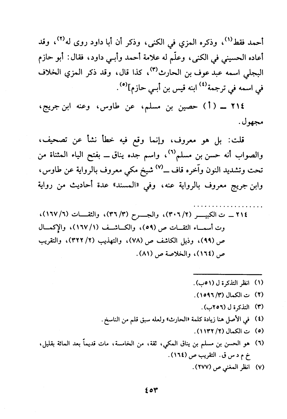 214- احُصَيْن بن مُسلم عَن طَاوس وَعنهُ بن جريج مَجْهُول قلت بل هُوَ مَعْرُوف وانما وَقع فِيهِ خطأ نَشأ عَن تَصْحِيف وَالصَّوَاب انه حسن بن مُسلم وَاسم جده يناق بِفَتْح الْيَاء الْمُثَنَّاة من تَحت وَتَشْديد النُّون وَآخره قَاف شيخ مكي مَعْرُوف بالرواية عَن طَاوس وَابْن جريج مَعْرُوف بالرواية عَنهُ وَفِي الْمسند عدَّة أَحَادِيث من رِوَايَة