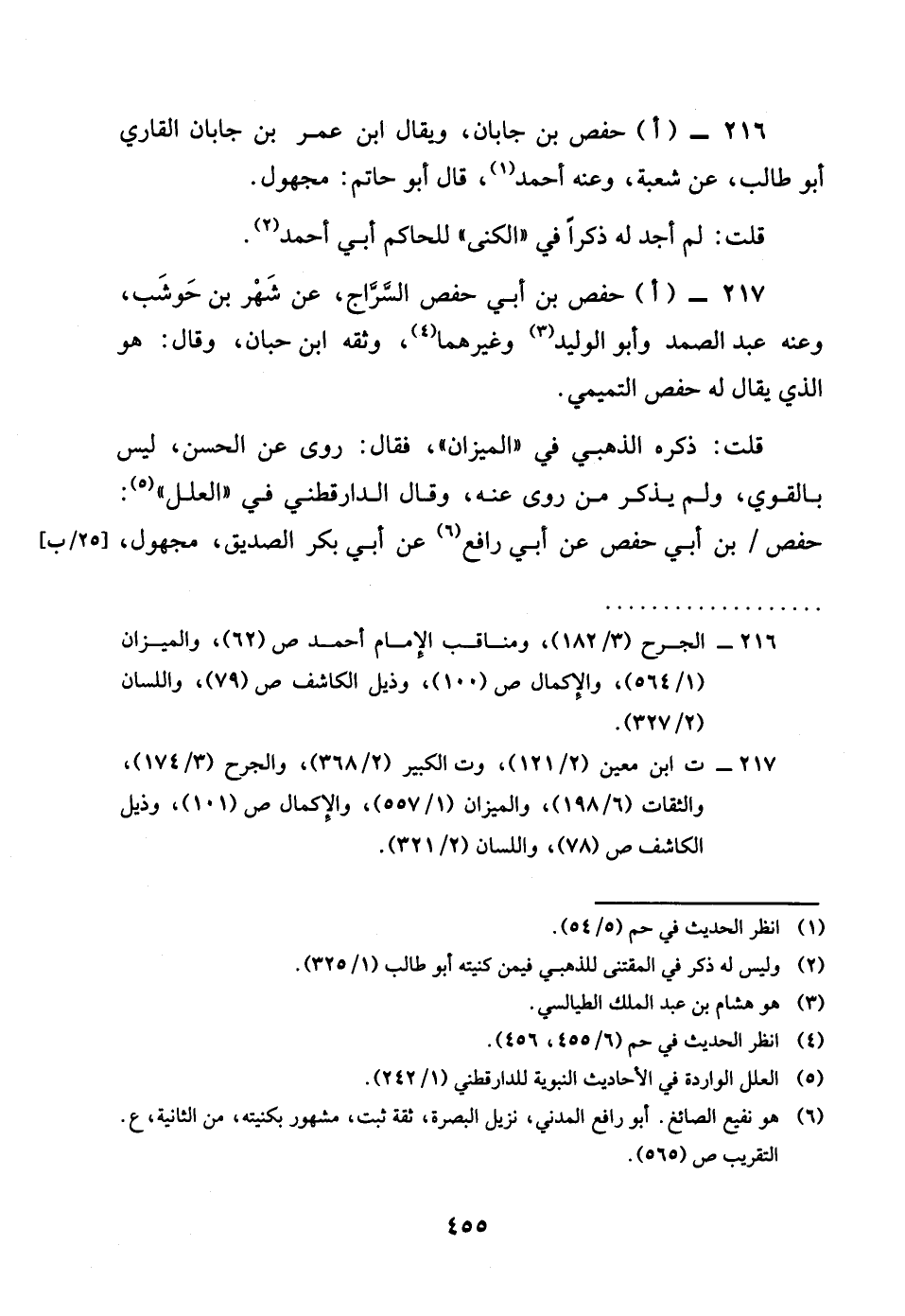 217- احَفْص بن أبي حَفْص السراج عَن شهر بن حَوْشَب وَعنهُ عبد الصَّمد وَأَبُو الْوَلِيد وَغَيرهمَا وَثَّقَهُ بن حبَان وَقَالَ هُوَ الَّذِي يُقَال لَهُ حَفْص التَّمِيمِي قلت ذكره الذَّهَبِيّ فِي الْمِيزَان فَقَالَ روى عَن الْحسن لَيْسَ بِالْقَوِيّ وَلم يذكر من روى عَنهُ وَقَالَ الدَّارَقُطْنِيّ فِي الْعِلَل حَفْص بن أبي حَفْص عَن أبي رَافع عَن أبي بكر الصّديق مَجْهُول