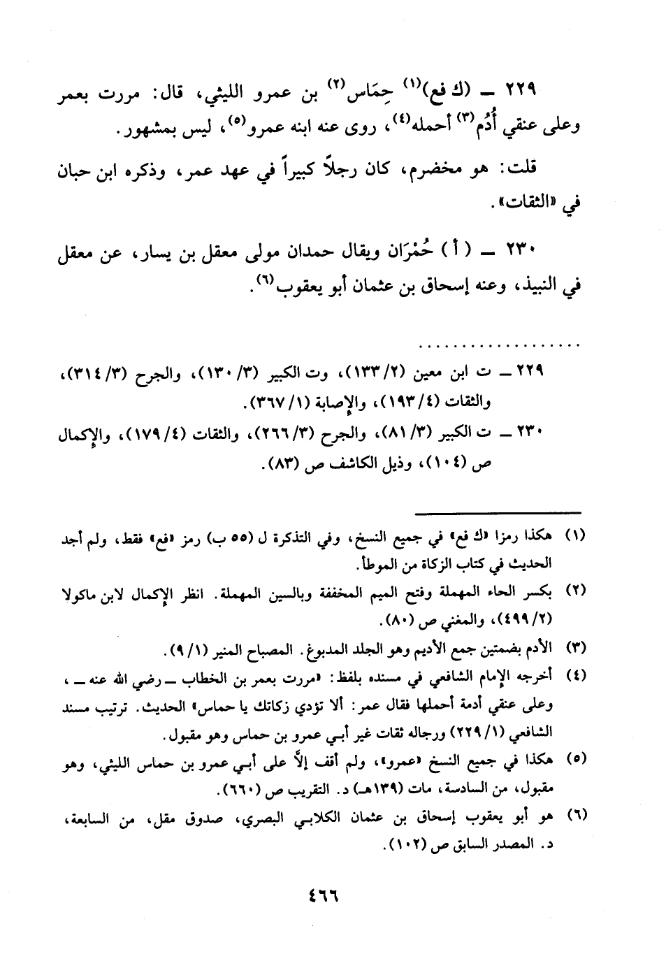 229 - ك فع حماس بن عَمْرو اللَّيْثِيّ قَالَ مَرَرْت بعمر وعَلى عنقِي آدم احمله روى عَنهُ ابْنه عَمْرو لَيْسَ بِمَشْهُور قلت هُوَ مخضرم كَانَ رجلا كَبِيرا فِي عهد عمر وَذكره بن حبَان فِي الثِّقَات