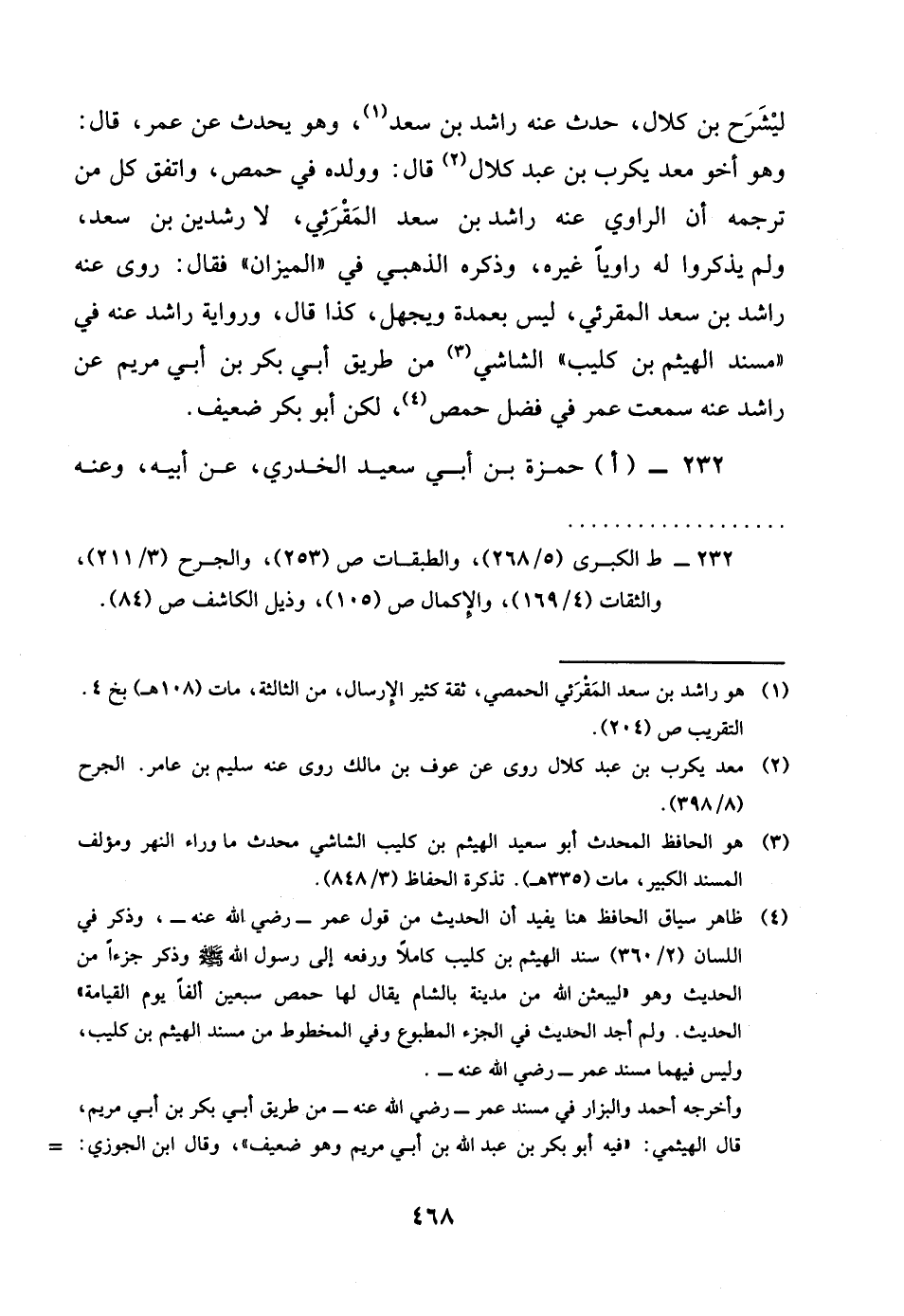 ليشرح بن كلال حدث عَنهُ رَاشد بن سعد وَهُوَ يحدث عَن عمر قَالَ وَهُوَ أَخُو معد يكرب بن عبد كلال قَالَ وَولده فِي حمص وَاتفقَ كل من تَرْجمهُ ان الرَّاوِي عَنهُ رَاشد بن سعد المقرئي لَا رشدين بن سعد وَلم يذكرُوا لَهُ رَاوِيا غَيره وَذكره الذَّهَبِيّ فِي الْمِيزَان فَقَالَ روى عَنهُ رَاشد بن سعد المقرئي لَيْسَ بعمدة ويجهل كَذَا قَالَ وَرِوَايَة رَاشد عَنهُ فِي مُسْند الْهَيْثَم بن كُلَيْب الشَّاشِي من طَرِيق أبي بكر بن أبي مَرْيَم عَن رَاشد عَنهُ سَمِعت عمر فِي فضل حمص لَكِن أَبُو بكر ضَعِيف