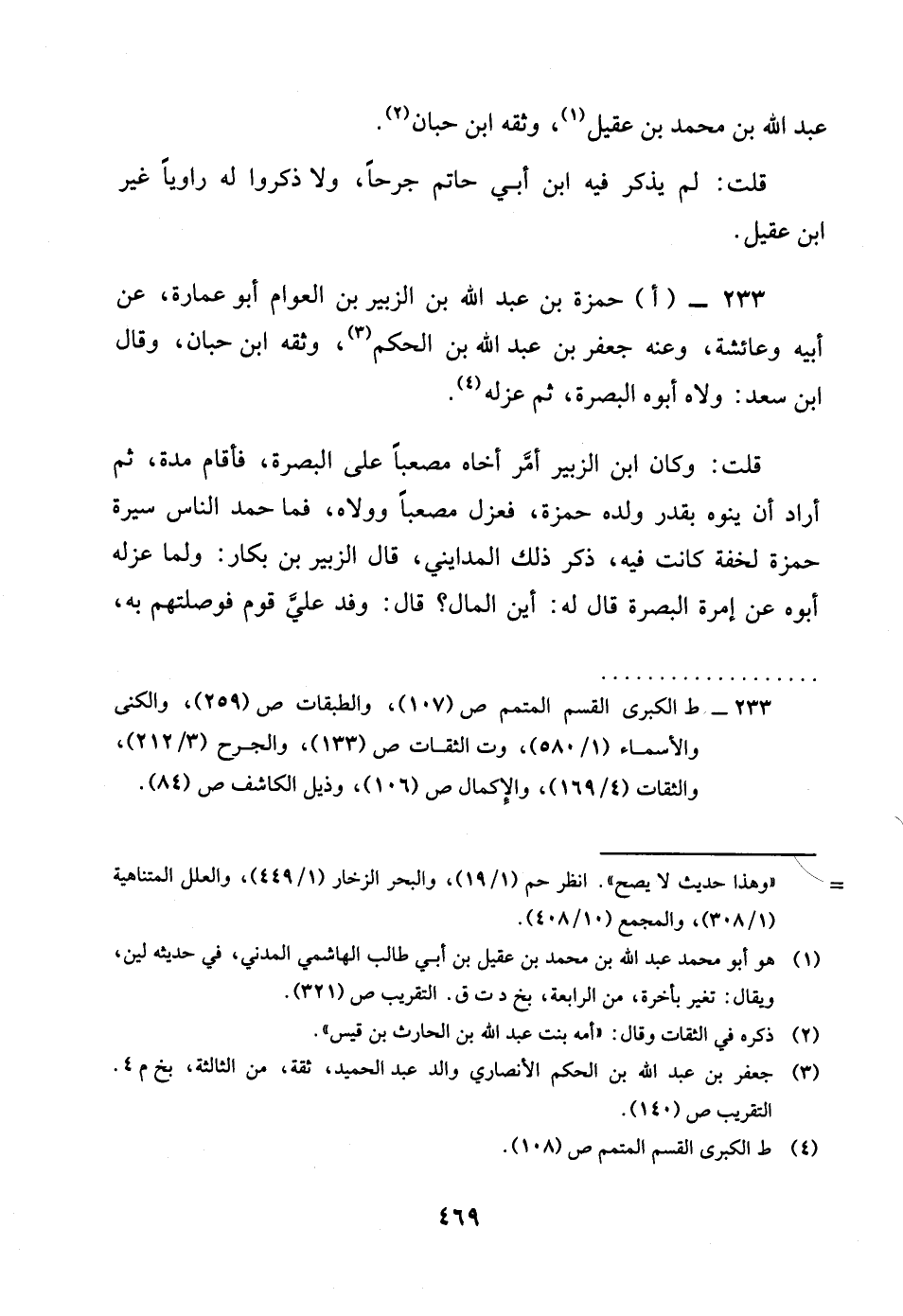 233 - احَمْزَة بن عبد الله بن الزبير بن الْعَوام أَبُو عمَارَة عَن أَبِيه وَعَائِشَة وَعنهُ جَعْفَر بن عبد الله بن الحكم وَثَّقَهُ بن حبَان وَقَالَ بن سعد ولاه أَبوهُ الْبَصْرَة ثمَّ عَزله قلت وَكَانَ بن الزبير أَمر اخاه مصعبا على الْبَصْرَة فاقأم مُدَّة ثمَّ أَرَادَ ان يُنَوّه بِقدر وَلَده حَمْزَة فعزل مصعبا وولاه فَمَا حمد النَّاس سيرة حَمْزَة لخفة كَانَت فِيهِ ذكر ذَلِك المدايني قَالَ الزبير بن بكار وَلما عَزله أَبوهُ عَن إمرة الْبَصْرَة قَالَ لَهُ أَيْن المَال قَالَ وَفد عَليّ قوم فوصلتهم بِهِ