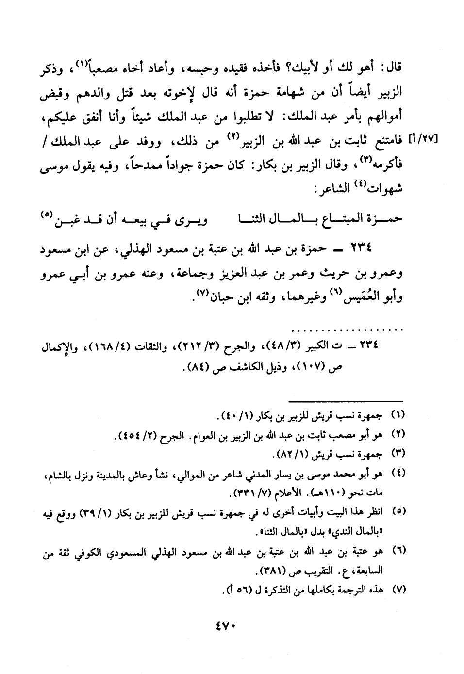 234 - حَمْزَة بن عبد الله بن عتبَة بن مَسْعُود الْهُذلِيّ عَن بن مَسْعُود وَعَمْرو بن حُرَيْث وَعمر بن عبد الْعَزِيز وَجَمَاعَة وَعنهُ عَمْرو بن أبي عَمْرو وَأَبُو العميس وَغَيرهمَا وَثَّقَهُ بن حبَان
