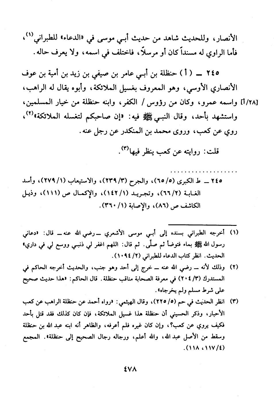 245 - احَنْظَلَة بن أبي عَامر بن صَيْفِي بن زيد بن أُميَّة بن عَوْف الْأنْصَارِيّ الأوسي رضى الله تَعَالَى عَنهُ وَهُوَ الْمَعْرُوف بغسيل الْمَلَائِكَة وَأَبوهُ يُقَال لَهُ الراهب واسْمه عَمْرو وَكَانَ من رُؤُوس الْكفْر وَابْنه حَنْظَلَة من خِيَار الْمُسلمين وَاسْتشْهدَ بِأحد وَقَالَ النَّبِي صلى الله عَلَيْهِ وَسلم فِيهِ ان صَاحبكُم لتغسله الْمَلَائِكَة روى عَن كَعْب وروى مُحَمَّد بن الْمُنْكَدر عَن رجل عَنهُ قلت رِوَايَته عَن كَعْب ينظر فِيهَا