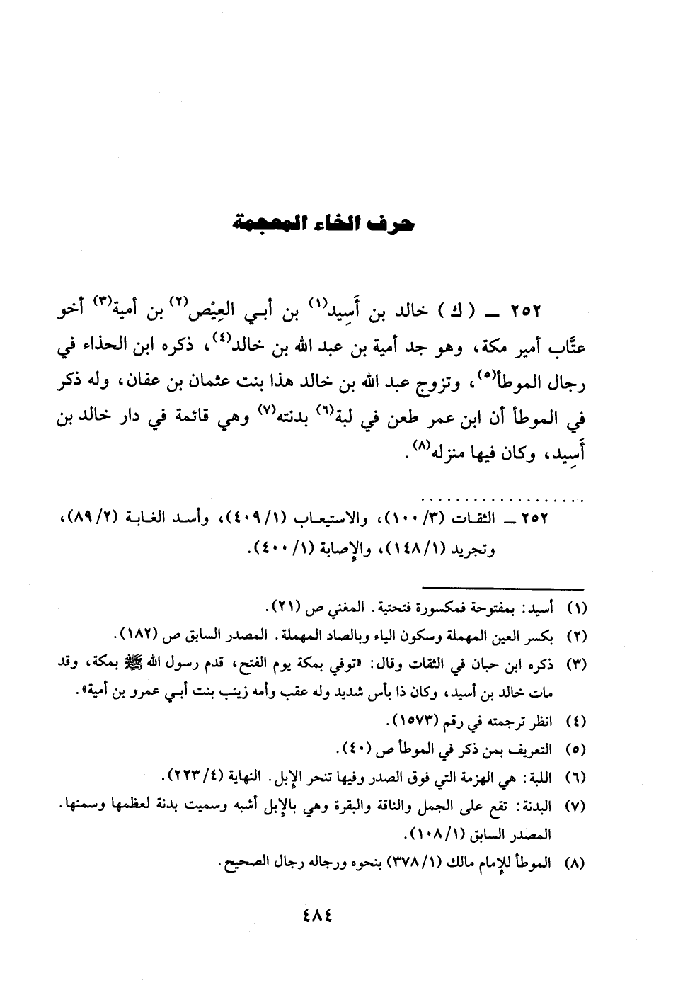 252 - ك خَالِد بن اسيد بن أبي الْعيص بن أُميَّة أَخُو عتاب أَمِير مَكَّة وَهُوَ جد أُميَّة بن عبد الله بن خَالِد ذكره بن الْحذاء فِي رجال الْمُوَطَّأ وَتزَوج عبد الله بن خَالِد هَذَا بنت عُثْمَان بن عَفَّان وَله ذكر فِي الْمُوَطَّأ ان بن عمر طعن فِي لبة بدنته وَهِي قَائِمَة فِي دَار خَالِد بن اسيد وَكَانَ فِيهَا