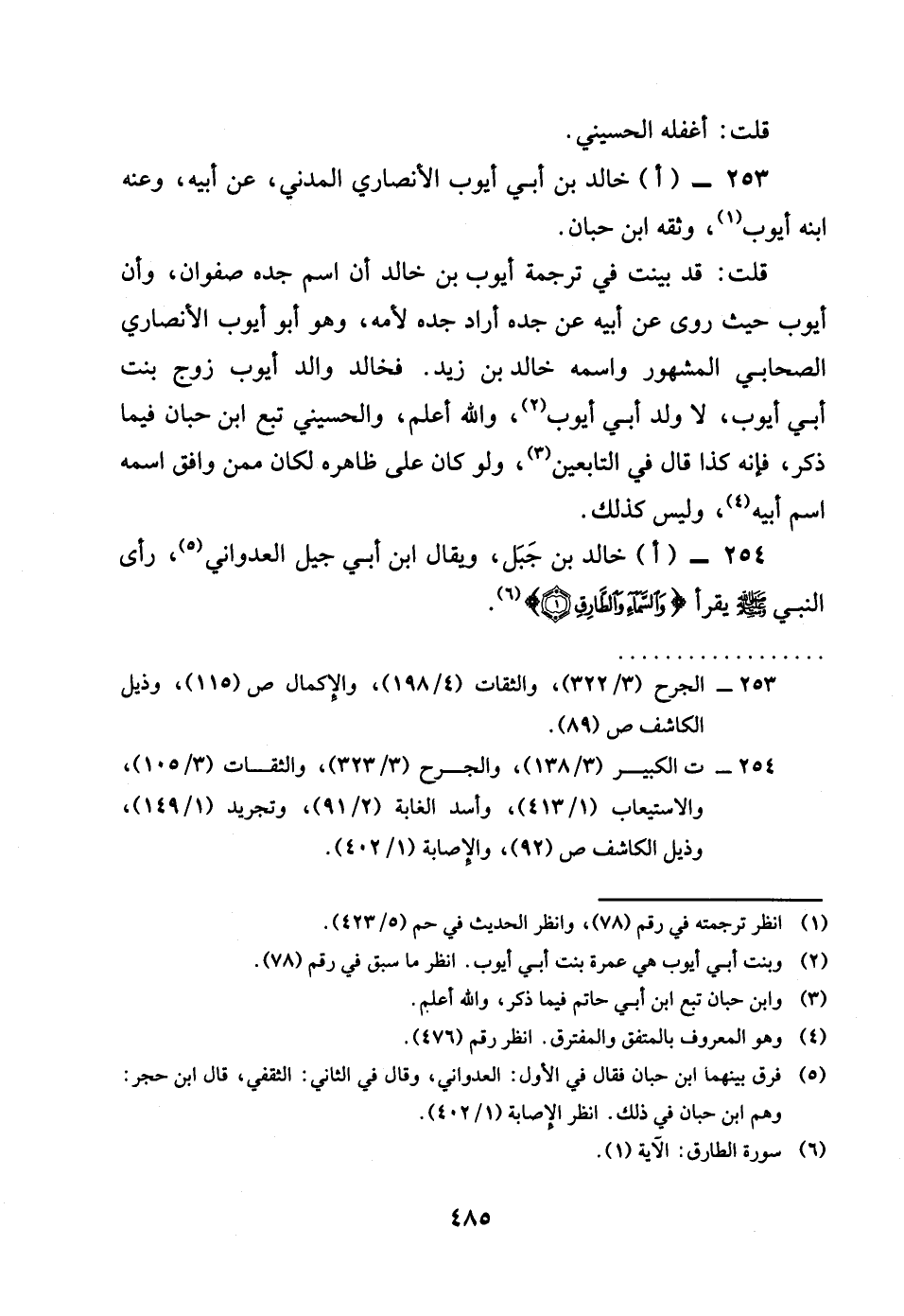 253 - اخَالِد بن أبي أَيُّوب الْأنْصَارِيّ الْمدنِي عَن أَبِيه وَعنهُ ابْنه أَيُّوب وَثَّقَهُ بن حبَان قلت قد بيّنت فِي تَرْجَمَة أَيُّوب بن خَالِد ان اسْم جده صَفْوَان وان أَيُّوب حَيْثُ روى عَن أَبِيه عَن جده أَرَادَ جده لامه وَهُوَ أَبُو أَيُّوب الْأنْصَارِيّ الصَّحَابِيّ الْمَشْهُور واسْمه خَالِد بن زيد فَخَالِد وَالِد أَيُّوب زوج بنت أبي أَيُّوب لَا ولد أبي أَيُّوب وَالله اعْلَم والحسيني تبع بن حبَان فِيمَا ذكره فَإِنَّهُ كَذَا قَالَ فِي التَّابِعين وَلَو كَانَ على ظَاهره لَكَانَ مِمَّن وَافق اسْمه اسْم أَبِيه وَلَيْسَ كَذَلِك
