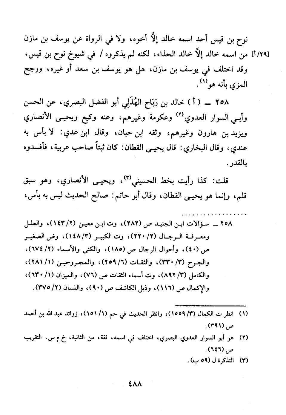 258 - اخَالِد بن رَبَاح الْهُذلِيّ أَبُو الْفضل الْبَصْرِيّ عَن الْحسن وَأبي السوار الْعَدوي وَعِكْرِمَة وَغَيرهم وَعنهُ وَكِيع وَيحيى الْأنْصَارِيّ وَيزِيد بن هَارُون وَغَيرهم وَثَّقَهُ بن حبَان وَقَالَ بن عدي لَا باس بِهِ عِنْدِي وَقَالَ البُخَارِيّ قَالَ يحيى الْقطَّان كَانَ ثبتا صَاحب عَرَبِيَّة فافسدوه بِالْقدرِ قلت كَذَا رَأَيْت بِخَط الْحُسَيْنِي وَيحيى الْأنْصَارِيّ وَهُوَ سبق قلم وانما هُوَ يحيى الْقطَّان وَقَالَ أَبُو حَاتِم صَالح الحَدِيث لَيْسَ بِهِ باس