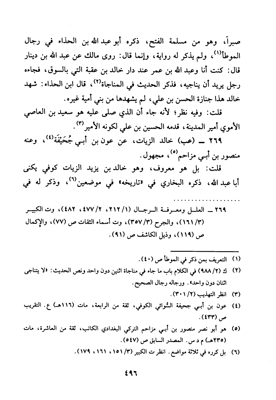 269 - عب خَالِد الزيات عَن عون بن أبي جُحَيْفَة وَعنهُ مَنْصُور بن أبي مُزَاحم مَجْهُول قلت بل هُوَ مَعْرُوف وَهُوَ خَالِد بن يزِيد الزيات كُوفِي يكنى أَبَا عبد الله ذكره البُخَارِيّ فِي تَارِيخه فِي موضِعين