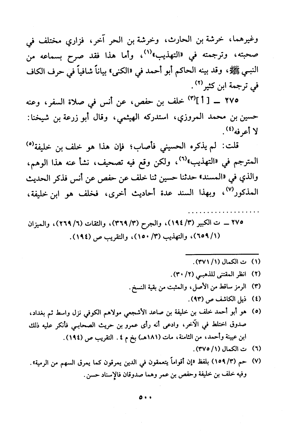 275 - اخلف بن حَفْص عَن أنس فِي صَلَاة السّفر وَعنهُ حُسَيْن بن مُحَمَّد الْمروزِي استدركه الهيثمي وَقَالَ أَبُو زرعه بن شَيخنَا لَا اعرفه قلت لم يذكرهُ الْحُسَيْنِي فَأصَاب فان هَذَا هُوَ خلف بن خَليفَة المترجم فِي التَّهْذِيب وَلَكِن وَقع فِيهِ تَصْحِيف نشا عَنهُ هَذَا الْوَهم وَالَّذِي فِي الْمسند حَدثنَا حُسَيْن ثَنَا خلف عَن حَفْص عَن أنس فَذكر الحَدِيث الْمَذْكُور وَبِهَذَا السَّنَد عدَّة أَحَادِيث أُخْرَى فخلف هُوَ بن خَليفَة