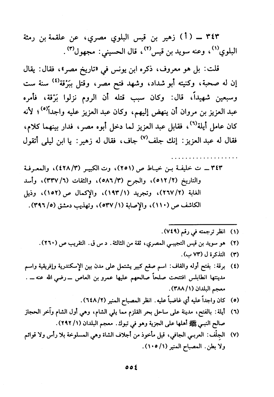 343- ازُهَيْر بن قيس البلوي مصري عَن عَلْقَمَة بن رمثة البلوي وَعنهُ سُوَيْد بن قيس قَالَ الْحُسَيْنِي مَجْهُول قلت بل هُوَ مَعْرُوف ذكره بن يُونُس فِي تَارِيخ مصر فَقَالَ يُقَال ان لَهُ صُحْبَة وكنيته أَبُو شَدَّاد وَشهد فتح مصر وَقتل ببرقة سنة سِتّ وَسبعين شَهِيدا قَالَ وَكَانَ سَبَب قَتله ان الرّوم نزلُوا برقة فامره عبد الْعَزِيز بن مَرْوَان ان ينْهض إِلَيْهِم وَكَانَ عبد الْعَزِيز عَلَيْهِ واجدا لِأَنَّهُ كَانَ عَامل أَيْلَة فقابل عبد الْعَزِيز لما دخل أَبوهُ مصر فدار بَينهمَا كَلَام فَقَالَ لَهُ عبد الْعَزِيز انك جلف جَاف فَقَالَ لَهُ زُهَيْر يَا بن ليلى أَتَقول