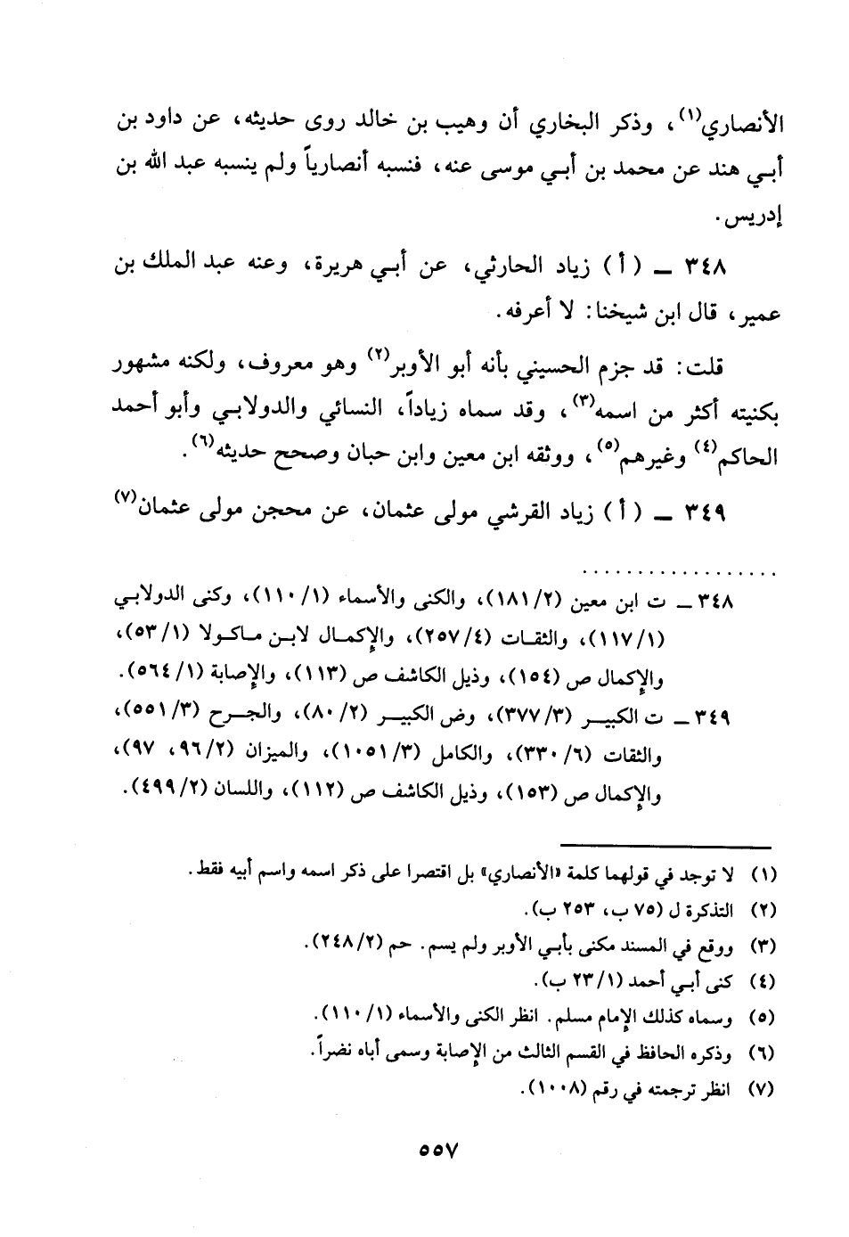 348 - ازِيَاد الْحَارِثِيّ عَن أبي هُرَيْرَة وَعنهُ عبد الْملك بن عُمَيْر قَالَ بن شَيخنَا لَا اعرفه قلت قد جزم الْحُسَيْنِي بِأَنَّهُ أَبُو الاوبر وَهُوَ مَعْرُوف وَلكنه مَشْهُور بكنيته أَكثر من اسْمه وَقد سَمَّاهُ زيادا النَّسَائِيّ والدولابي وَأَبُو أَحْمد الْحَاكِم وَغَيرهم وَوَثَّقَهُ بن معِين وَابْن حبَان وَصحح حَدِيثه