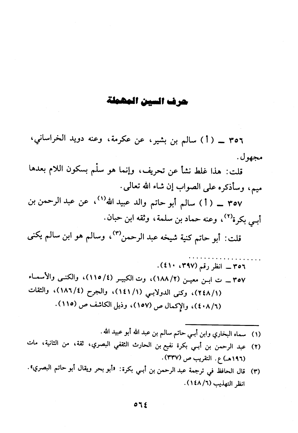 357 - اسَالم أَبُو حَاتِم وَالِد عبيد الله عَن عبد الرَّحْمَن بن أبي بكرَة وَعنهُ حَمَّاد بن سَلمَة وَثَّقَهُ بن حبَان قلت أَبُو حَاتِم كنية شَيْخه عبد الرَّحْمَن وَسَالم هُوَ بن سَالم يكنى