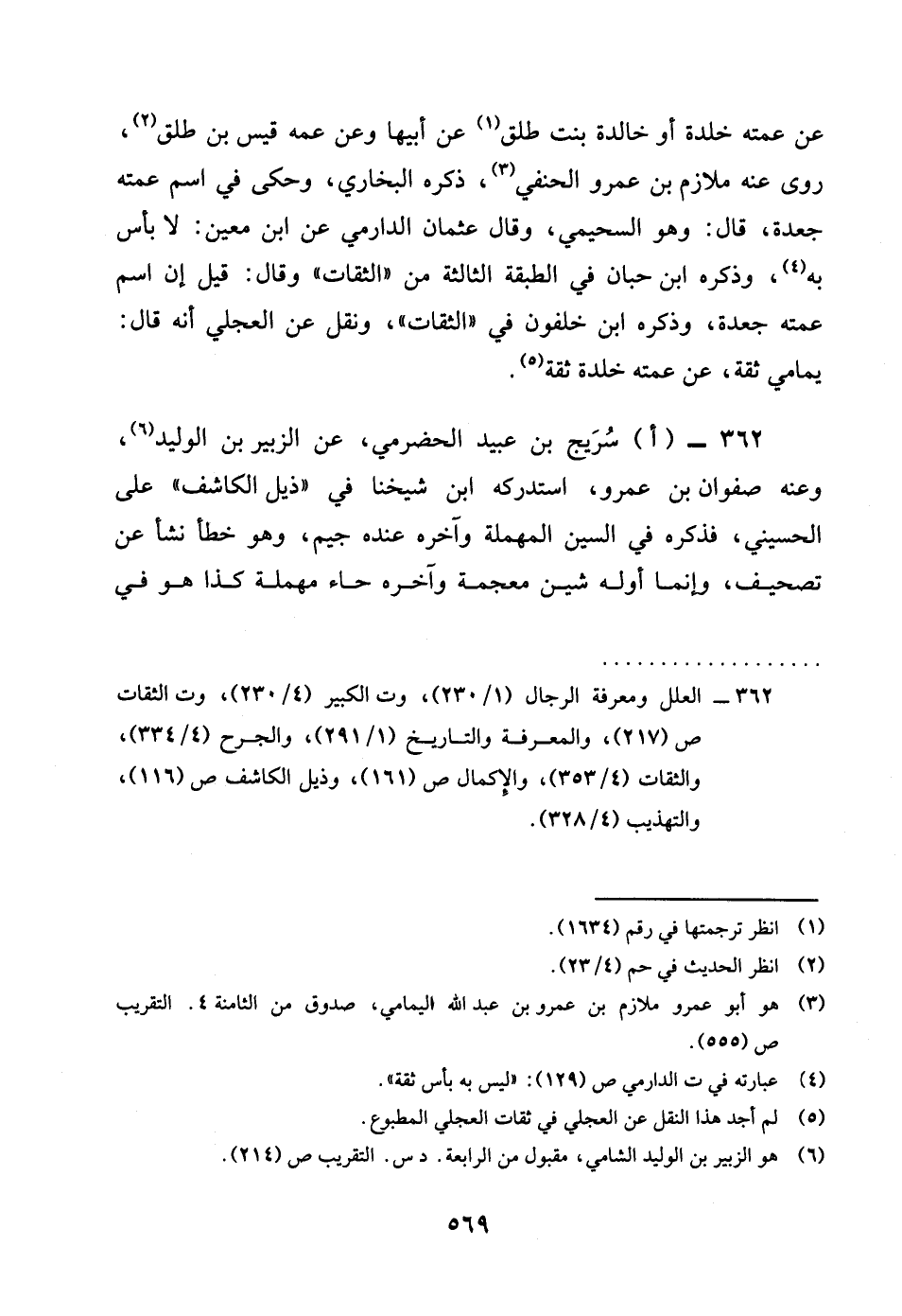 362 - اسُرَيج بن عبيد الْحَضْرَمِيّ عَن الزبير بن الْوَلِيد وَعنهُ صَفْوَان بن عَمْرو استدركه بن شَيخنَا فِي ذيل الكاشف على الْحُسَيْنِي فَذكره فِي السِّين الْمُهْملَة وَآخره عِنْده جِيم وَهُوَ خطأ نَشأ عَن تَصْحِيف وَإِنَّمَا أَوله شين مُعْجمَة وَآخره حاء مُهْملَة كَذَا هُوَ
