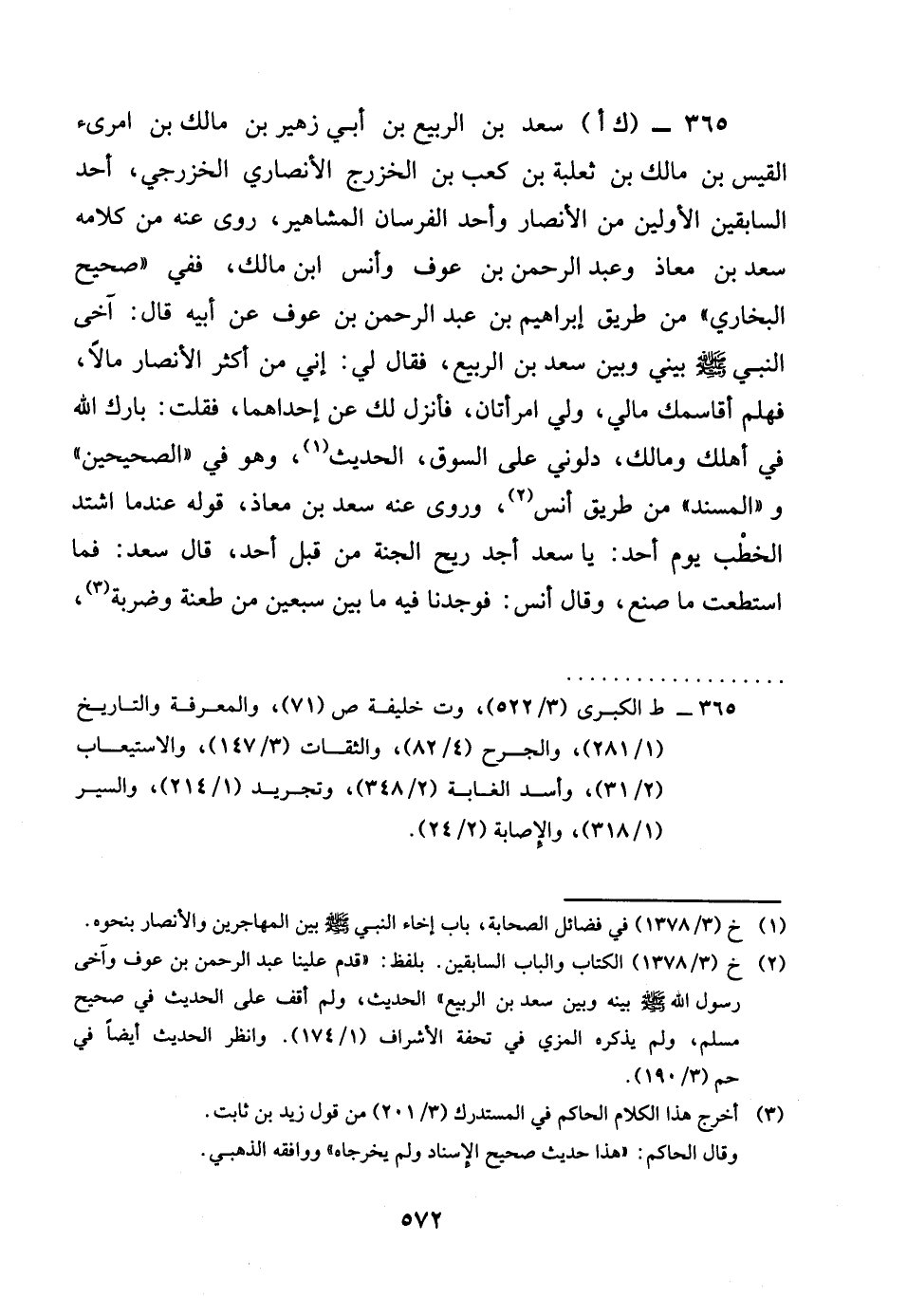 365 - ك اسعد بن الرّبيع بن أبي زُهَيْر بن مَالك بن امْرِئ الْقَيْس بن مَالك بن ثَعْلَبَة بن كَعْب بن الْخَزْرَج الْأنْصَارِيّ الخزرجي أحد السَّابِقين الْأَوَّلين من الْأَنْصَار وَاحِد الفرسان الْمَشَاهِير روى عَنهُ من كَلَامه سعد بن معَاذ وَعبد الرَّحْمَن بن عَوْف وَأنس بن مَالك فَفِي صَحِيح البُخَارِيّ من طَرِيق إِبْرَاهِيم بن عبد الرَّحْمَن بن عَوْف عَن أَبِيه قَالَ آخى النَّبِي صلى الله عَلَيْهِ وَسلم بيني وَبَين سعد بن الرّبيع فَقَالَ لي إِنِّي من أَكثر الْأَنْصَار مَالا فَهَلُمَّ اقاسمك مَالِي ولي امْرَأَتَانِ فَأنْزل لَك عَن إِحْدَاهمَا فَقلت بَارك الله فِي أهلك وَمَالك دلوني على السُّوق الحَدِيث وَهُوَ فِي الصَّحِيحَيْنِ والمسند من طَرِيق أنس وروى عَنهُ سعد بن معَاذ قَوْله عِنْدَمَا اشْتَدَّ الْخطب يَوْم أحد يَا سعد أجد ريح الْجنَّة من قبل أحد قَالَ سعد فَمَا اسْتَطَعْت مَا صنع وَقَالَ أنس فَوَجَدنَا فِيهِ مَا بَين سبعين من طعنة وضربة