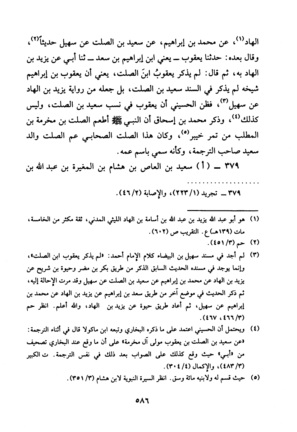 الْهَاد عَن مُحَمَّد بن إِبْرَاهِيم عَن سعيد بن الصَّلْت عَن سُهَيْل حَدِيثا وَقَالَ بعده حَدثنَا يَعْقُوب يعْنى بن إِبْرَاهِيم بن سعد ثَنَا أبي عَن يزِيد بن الْهَاد بِهِ ثمَّ قَالَ لم يذكر يَعْقُوب بن الصَّلْت يعْنى أَن يَعْقُوب بن إِبْرَاهِيم شَيْخه لم يذكر فِي السَّنَد سعيد بن الصَّلْت بل جعله من رِوَايَة يزِيد بن الْهَاد عَن سُهَيْل فَظن الْحُسَيْنِي أَن يَعْقُوب فِي نسب سعيد بن الصَّلْت وَلَيْسَ كَذَلِك وَذكر مُحَمَّد بن إِسْحَاق أَن النَّبِي صلى الله عَلَيْهِ وَسلم اطعم الصَّلْت بن مخرمَة بن الْمطلب من تمر خَيْبَر وَكَانَ هَذَا الصَّلْت الصَّحَابِيّ عَم الصَّلْت وَالِد سعيد صَاحب التَّرْجَمَة وَكَأَنَّهُ سمى باسم عَمه