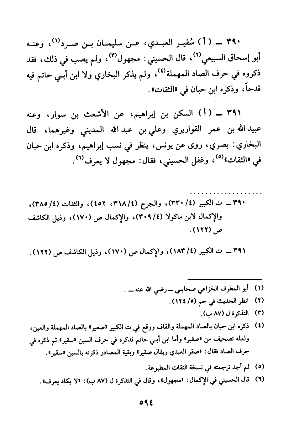390 - اسقير الْعَبْدي عَن سُلَيْمَان بن صرد وَعنهُ أَبُو إِسْحَاق السبيعِي قَالَ الْحُسَيْنِي مَجْهُول وَلم يصب فِي ذَلِك فقد ذَكرُوهُ فِي حرف الصَّاد الْمُهْملَة وَلم يذكر البُخَارِيّ وَلَا بن أبي حَاتِم فِيهِ قدحا وَذكره بن حبَان فِي الثِّقَات