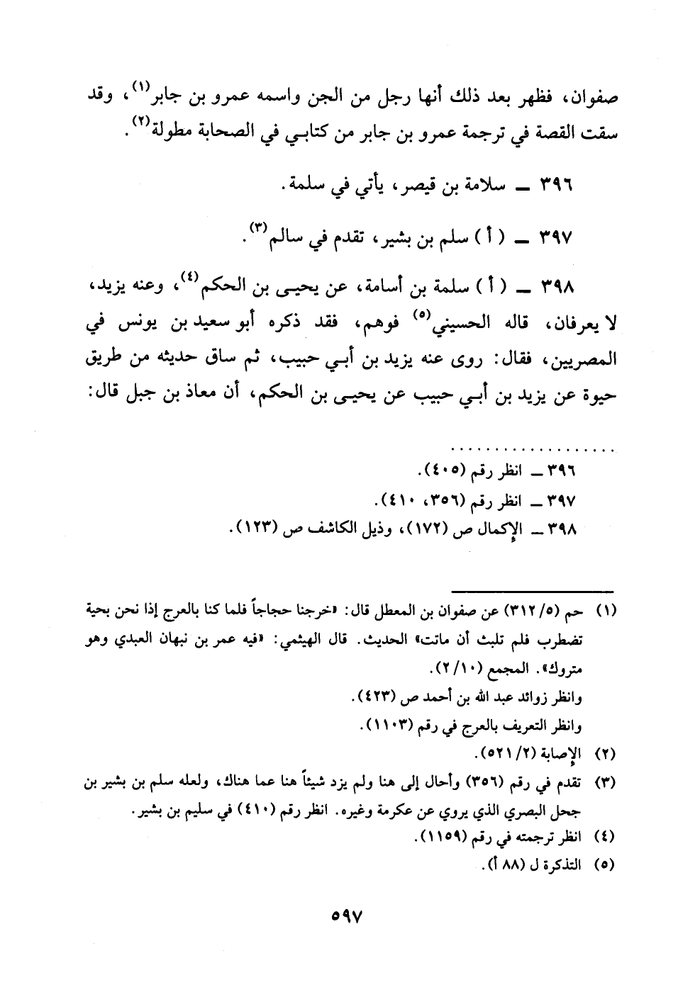 398 - اسَلمَة بن أُسَامَة عَن يحيى بن الحكم وَعنهُ يزِيد لَا يعرفان قَالَه الْحُسَيْنِي فَوَهم فقد ذكره أَبُو سعيد بن يُونُس فِي المصريين فَقَالَ روى عَنهُ يزِيد بن أبي حبيب ثمَّ سَاق حَدِيثه من طَرِيق حَيْوَة عَن يزِيد بن أبي حبيب يحيى بن الحكم أَن معَاذ بن جبل قَالَ