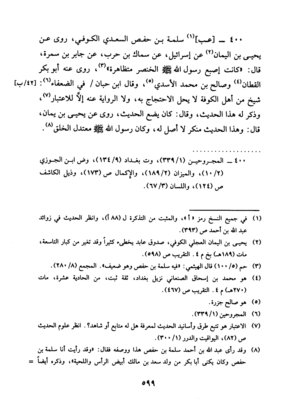 400 - عب سَلمَة بن حَفْص السَّعْدِيّ الْكُوفِي روى عَن يحيى بن الْيَمَان عَن إِسْرَائِيل عَن سماك بن حَرْب عَن جَابر بن سَمُرَة قَالَ كَانَت أصْبع رَسُول الله صلى الله عَلَيْهِ وَسلم الْخِنْصر متظاهرة روى عَنهُ أَبُو بكر الْقطَّان وَصَالح بن مُحَمَّد الْأَسدي وَقَالَ بن حبَان فِي الضُّعَفَاء شيخ من أهل الْكُوفَة لَا يحل الِاحْتِجَاج بِهِ وَلَا الرِّوَايَة عَنهُ الا للاعتبار وَذكر لَهُ هَذَا الحَدِيث وَقَالَ كَانَ يضع الحَدِيث روى عَن يحيى بن الْيَمَان قَالَ وَهَذَا الحَدِيث مُنكر لَا أصل لَهُ وَكَانَ رَسُول الله صلى الله عَلَيْهِ وَسلم معتدل الْخلق