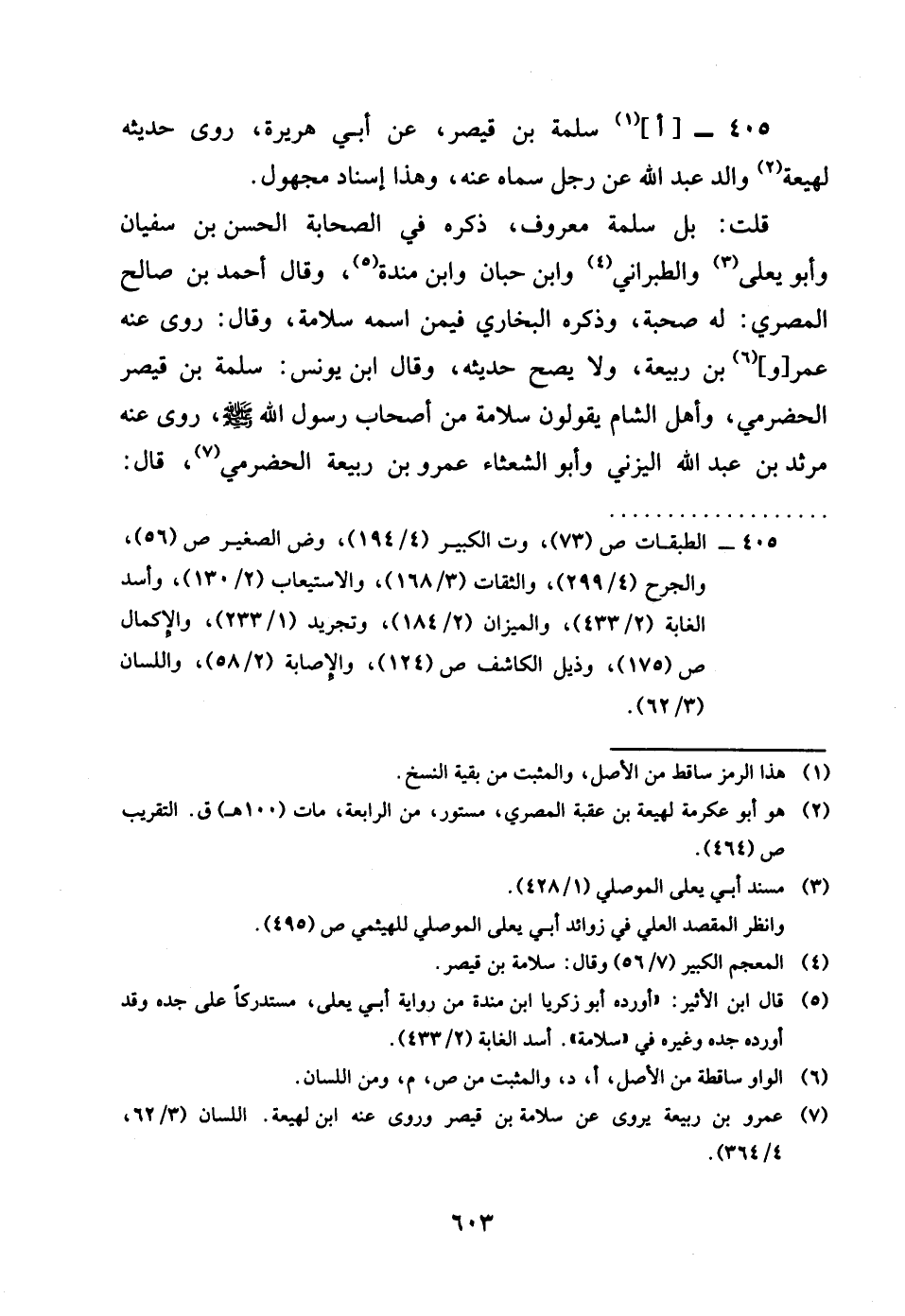 405 - سَلمَة بن قَيْصر عَن أبي هُرَيْرَة روى حَدِيثه لَهِيعَة وَالِد عبد الله عَن رجل سَمَّاهُ عَنهُ وَهَذَا إِسْنَاد مَجْهُول قلت بل سَلمَة مَعْرُوف ذكره فِي الصَّحَابَة الْحسن بن سُفْيَان وَأَبُو يعلى وَالطَّبَرَانِيّ وَابْن حبَان وَابْن مندة وَقَالَ أَحْمد بن صَالح الْمصْرِيّ لَهُ صُحْبَة وَذكره البُخَارِيّ فِيمَن اسْمه سَلامَة وَقَالَ روى عَنهُ عَمْرو بن ربيعَة وَلَا يَصح حَدِيثه وَقَالَ بن يُونُس سَلمَة بن قَيْصر الْحَضْرَمِيّ وَأهل الشَّام يَقُولُونَ سَلامَة من أَصْحَاب رَسُول الله صلى الله عَلَيْهِ وَسلم روى عَنهُ مرْثَد بن عبد الله الْيَزنِي وَأَبُو الشعْثَاء عَمْرو بن ربيعَة الْحَضْرَمِيّ قَالَ