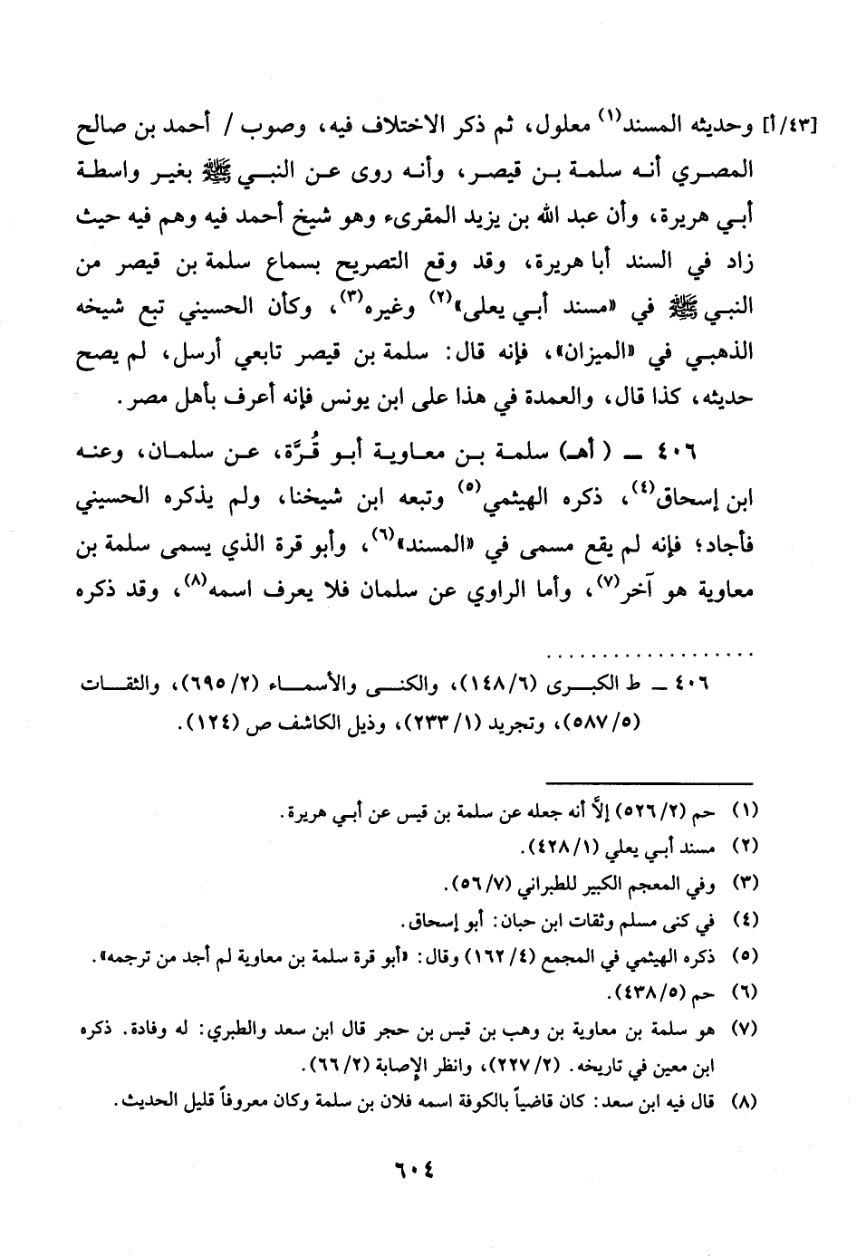 406 - اسَلمَة بن مُعَاوِيَة أَبُو قُرَّة عَن سلمَان وَعنهُ بن إِسْحَاق ذكره الهيثمي وَتَبعهُ بن شَيخنَا وَلم يذكرهُ الْحُسَيْنِي فأجاد فَإِنَّهُ لم يَقع مُسَمّى فِي الْمسند وَأَبُو قُرَّة الَّذِي يُسمى سَلمَة بن مُعَاوِيَة هُوَ آخر واما الرَّاوِي عَن سلمَان فَلَا يعرف اسْمه وَقد ذكره