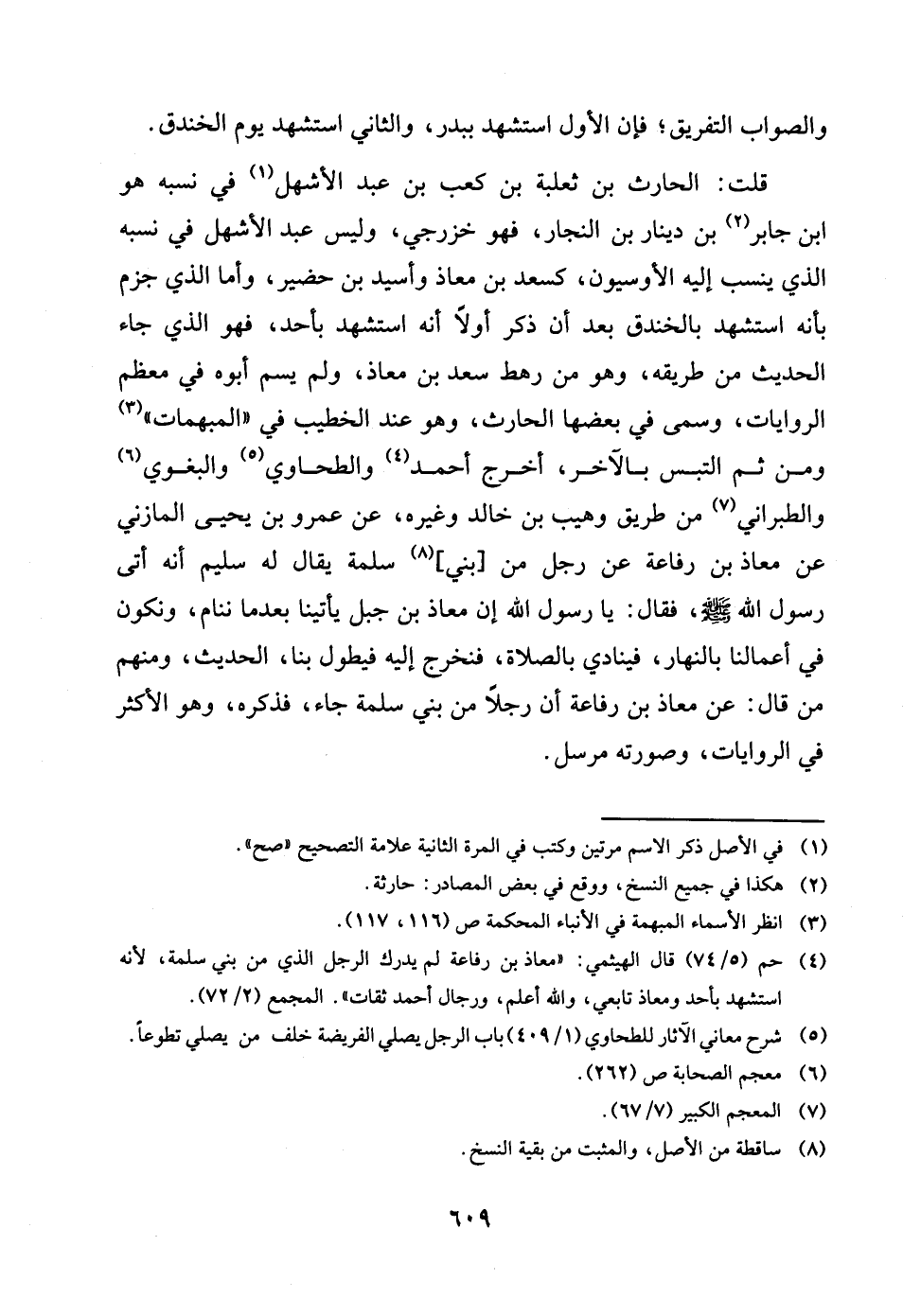 وَالصَّوَاب التَّفْرِيق فَإِن الأول اسْتشْهد ببدر وَالثَّانِي اسْتشْهد يَوْم الخَنْدَق قلت الْحَارِث بن ثَعْلَبَة بن كَعْب بن عبد الْأَشْهَل فِي نسبه هُوَ بن جَابر بن دِينَار بن النجار فَهُوَ خزرجي وَلَيْسَ عبد الْأَشْهَل فِي نسبه الَّذِي ينْسب اليه الاوسيون كسعد بن معَاذ وَأسيد بن حضير واما الَّذِي جزم بِأَنَّهُ اسْتشْهد بالخندق بعد أَن ذكر أَولا أَنه اسْتشْهد بِأحد فَهُوَ الَّذِي جَاءَ الحَدِيث من طَرِيقه وَهُوَ من رَهْط سعد بن معَاذ وَلم يسم أَبوهُ فِي مُعظم الرِّوَايَات وَسمي فِي بَعْضهَا الْحَارِث وَهُوَ عِنْد الْخَطِيب فِي المبهمات وَمن ثمَّ الْتبس بِالْآخرِ اخْرُج أَحْمد والطَّحَاوِي وَالْبَغوِيّ وَالطَّبَرَانِيّ من طَرِيق وهيب بن خَالِد وَغَيره عَن عَمْرو بن يحيى الْمَازِني عَن معَاذ بن رِفَاعَة عَن رجل من بني سَلمَة يُقَال لَهُ سليم أَنه اتى رَسُول الله صلى الله عَلَيْهِ وَسلم فَقَالَ يَا رَسُول الله إِن معَاذ بن جبل ياتينا بعد مَا ننأم ونكون فِي اعمالنا بِالنَّهَارِ فينادي بالصلوة فنخرج اليه فَيطول بِنَا الحَدِيث وَمِنْهُم من قَالَ عَن معَاذ بن رِفَاعَة أَن رجلا من بني سَلمَة جَاءَ فَذكره وَهُوَ الْأَكْثَر فِي الرويات وَصورته مُرْسل