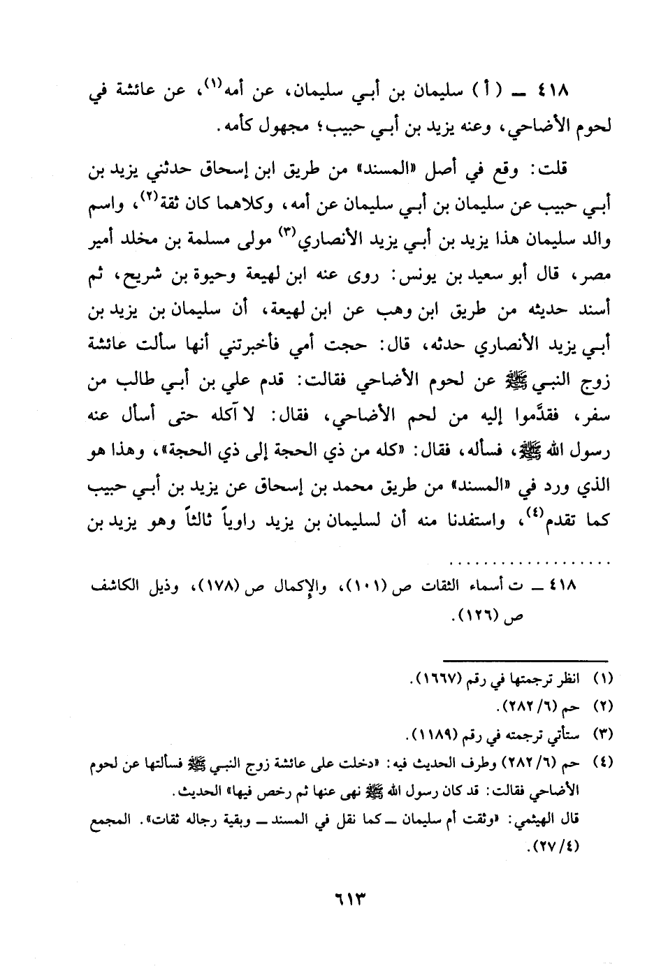 418 - اسُلَيْمَان بن أبي سُلَيْمَان عَن أمه عَن عَائِشَة رضى الله تَعَالَى عَنْهَا فِي لُحُوم الْأَضَاحِي وَعنهُ يزِيد بن أبي حبيب مَجْهُول كَأُمِّهِ قلت وَقع فِي أصل الْمسند من طَرِيق بن إِسْحَاق حَدثنِي يزِيد بن أبي حبيب عَن سُلَيْمَان بن أبي سُلَيْمَان عَن أمه وَكِلَاهُمَا كَانَ ثِقَة وَاسم وَالِد سُلَيْمَان هَذَا يزِيد بن أبي يزِيد الْأنْصَارِيّ مولى مسلمة بن مخلد أَمِير مصر قَالَ أَبُو سعيد بن يُونُس روى عَنهُ بن لَهِيعَة وحيوة بن شُرَيْح ثمَّ اسند حَدِيثه من طَرِيق بن وهب عَن بن لَهِيعَة أَن سُلَيْمَان بن يزِيد بن أبي يزِيد الْأنْصَارِيّ حَدثهُ قَالَ حجت أُمِّي فاخبرتني أَنَّهَا سَأَلت عَائِشَة زوج النَّبِي صلى الله عَلَيْهِ وَسلم عَن لُحُوم الْأَضَاحِي فَقَالَت قدم عَليّ بن أبي طَالب من سفر فقدموا اليه من لحم الْأَضَاحِي فَقَالَ لَا آكله حَتَّى اسْأَل عَنهُ رَسُول الله صلى الله عَلَيْهِ وَسلم فَسَأَلَهُ فَقَالَ كُله من ذِي الْحجَّة الى ذِي الْحجَّة وَهَذَا هُوَ الَّذِي ورد فِي الْمسند من طَرِيق مُحَمَّد بن إِسْحَاق عَن يزِيد بن أبي حبيب كَمَا تقدم واستفدنا مِنْهُ أَن لِسُلَيْمَان بن يزِيد رَاوِيا ثَالِثا وَهُوَ يزِيد بن