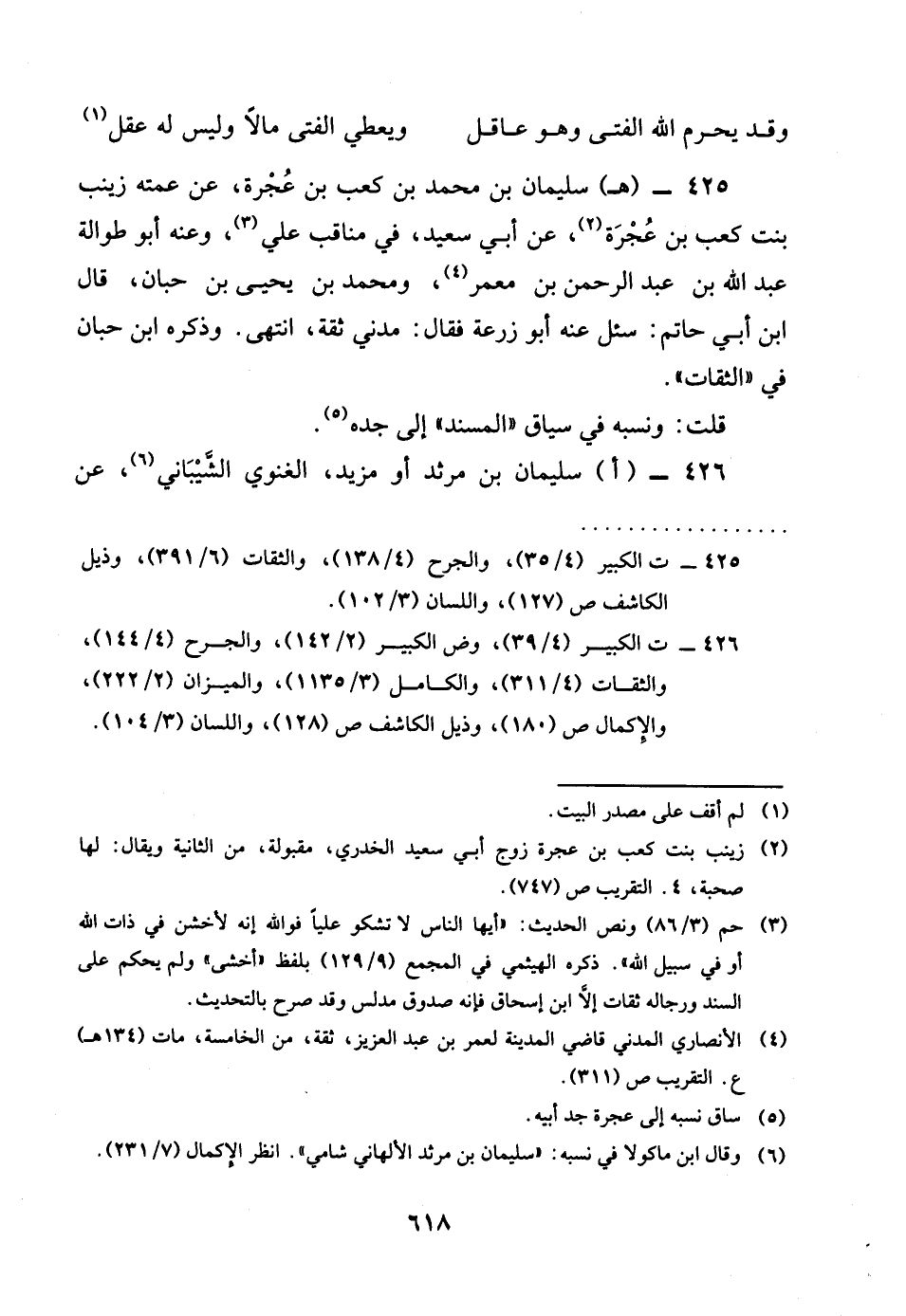 425 - هـ سُلَيْمَان بن مُحَمَّد بن كَعْب بن عجْرَة عَن عمته زَيْنَب بنت كَعْب بن عجْرَة عَن أبي سعيد فِي مَنَاقِب عَليّ رضى الله تَعَالَى عَنهُ وَعنهُ أَبُو طوالة عبد الله بن عبد الرَّحْمَن بن معمر وَمُحَمّد بن يحيى بن حبَان وَقَالَ بن أبي حَاتِم سُئِلَ عَنهُ أَبُو زرْعَة فَقَالَ مدنِي ثِقَة انْتهى وَذكره بن حبَان فِي الثِّقَات قلت وَنسبه فِي سِيَاق الْمسند الى جده