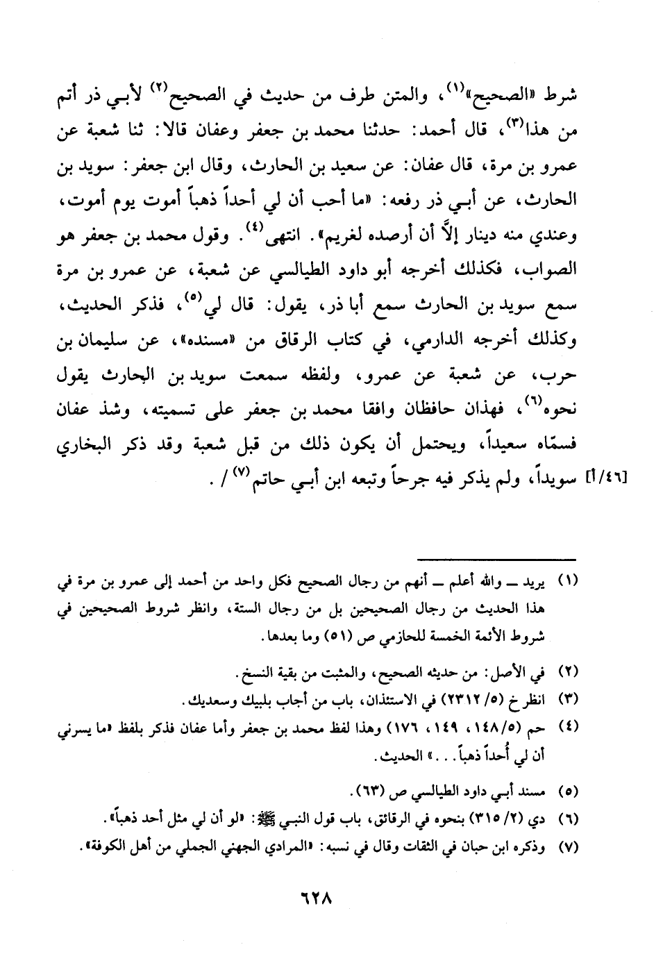 شَرط الصَّحِيح والمتن طرف من حَدِيث فِي الصَّحِيح لأبي ذَر أتم من هَذَا قَالَ أَحْمد حَدثنَا مُحَمَّد بن جَعْفَر وَعَفَّان قَالَا ثَنَا شُعْبَة عَن عَمْرو بن مرّة قَالَ عَفَّان عَن سعيد بن الْحَارِث وَقَالَ بن جَعْفَر سُوَيْد بن الْحَارِث عَن أبي ذَر رَفعه مَا أحب أَن لي أحدا ذَهَبا اموت يَوْم اموت وَعِنْدِي مِنْهُ دِينَار الا أَن ارصده لغريم انْتهى وَقَول مُحَمَّد بن جَعْفَر هُوَ الصَّوَاب فَكَذَلِك أخرجه أَبُو دَاوُد الطَّيَالِسِيّ عَن شُعْبَة عَن عَمْرو بن مرّة سمع سُوَيْد بن الْحَارِث سمع أَبَا ذَر يَقُول قَالَ لي فَذكر الحَدِيث وَكَذَلِكَ أخرجه الدَّارمِيّ فِي كتاب الرقَاق من مُسْنده عَن سُلَيْمَان بن حَرْب عَن شُعْبَة عَن عَمْرو وَلَفظه سَمِعت سُوَيْد بن الْحَارِث يَقُول نَحوه فهذان حَافِظَانِ وافقا مُحَمَّد بن جَعْفَر على تَسْمِيَته وشذ عَفَّان فَسَماهُ سعيدا ويحْتَمل أَن يكون ذَلِك من قبل شُعْبَة وَقد ذكر البُخَارِيّ سويدا وَلم يذكر فِيهِ جرحا وَتَبعهُ بن أبي حَاتِم