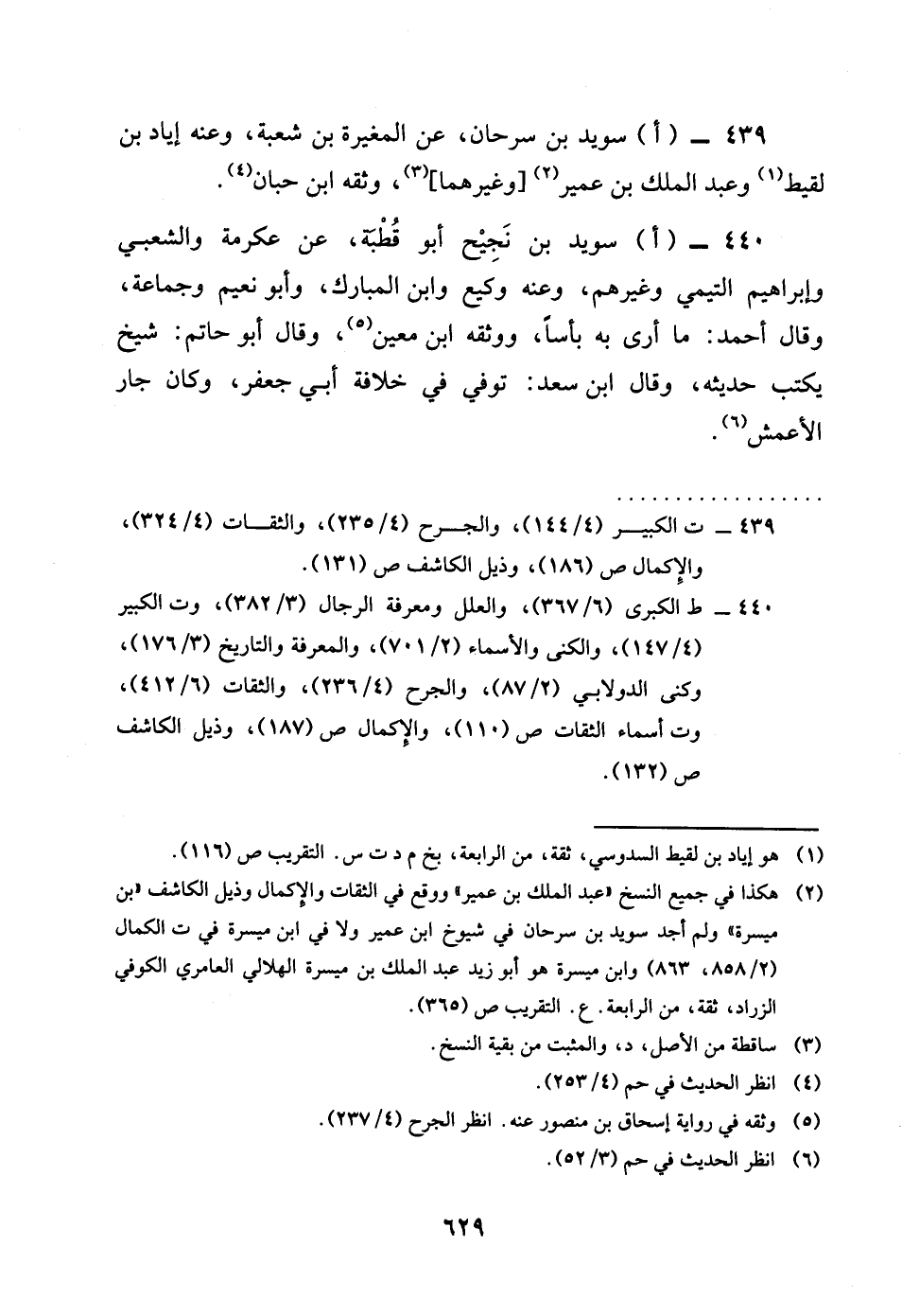 439 - اسُوَيْد بن سرحان عَن الْمُغيرَة بن شُعْبَة وَعنهُ اياد بن لَقِيط وَعبد الْملك بن عُمَيْر وَغَيرهمَا وَثَّقَهُ بن حبَان