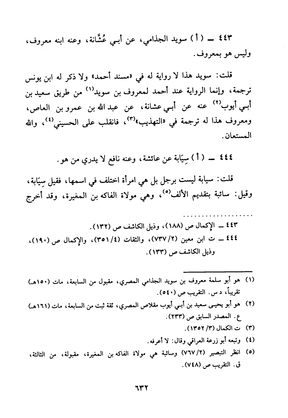 443 - اسُوَيْد الجذامي عَن أبي عشانة وَعنهُ ابْنه مَعْرُوف وَلَيْسَ هُوَ بِمَعْرُوف قلت سُوَيْد هَذَا لَا رِوَايَة لَهُ فِي مُسْند أَحْمد وَلَا ذكر لَهُ بن يُونُس تَرْجَمَة وانما الرِّوَايَة عِنْد أَحْمد لمعروف بن سُوَيْد من طَرِيق سعيد بن أبي أَيُّوب عَنهُ عَن أبي عشانة عَن عبد الله بن عَمْرو بن الْعَاصِ ومعروف هَذَا لَهُ تَرْجَمَة فِي التَّهْذِيب فَانْقَلَبَ على الْحُسَيْنِي وَالله الْمُسْتَعَان
