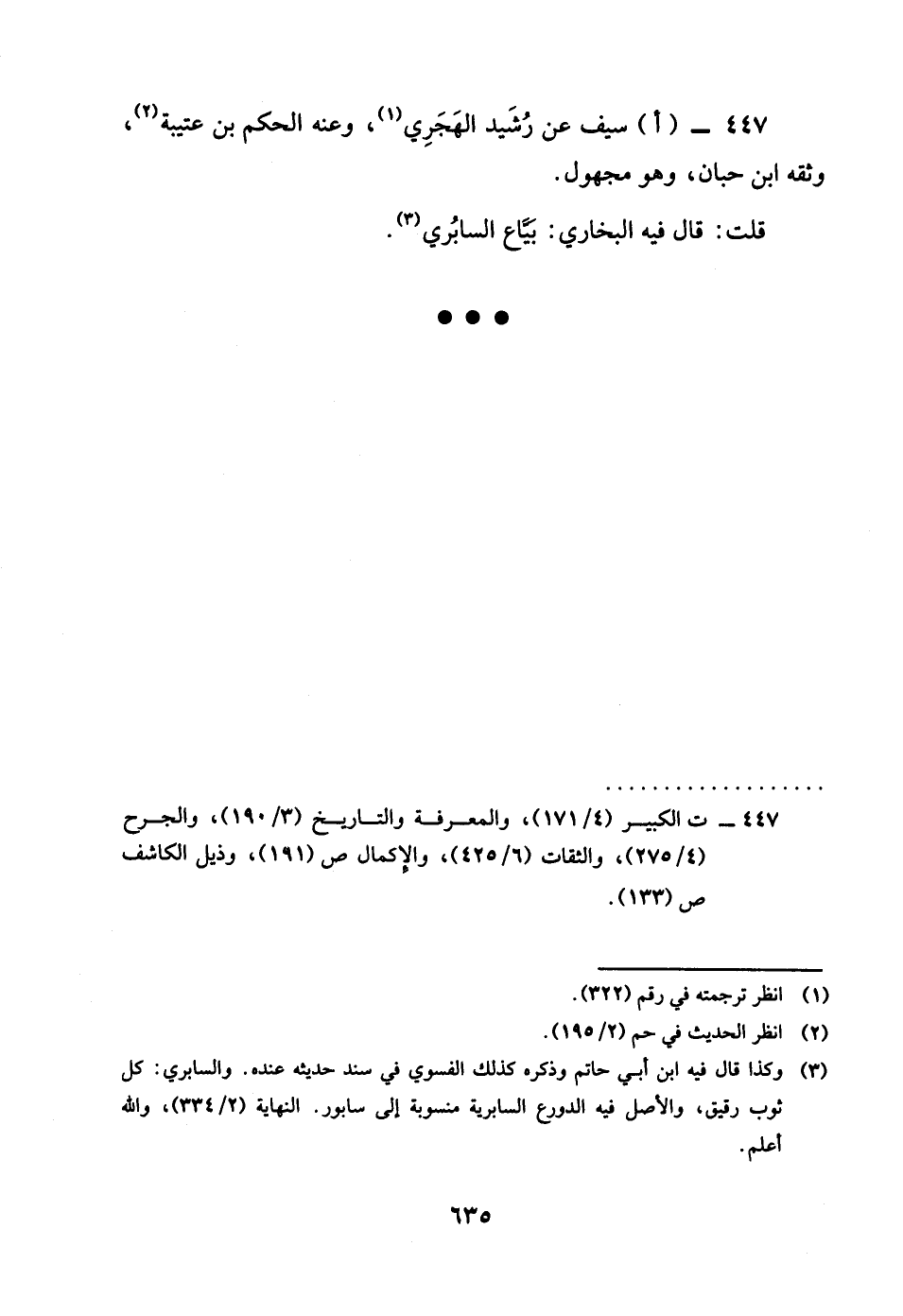 447 - اسيف عَن رشيد الهجري وَعنهُ الحكم بن عتيبة وَثَّقَهُ بن حبَان وَهُوَ مَجْهُول قلت قَالَ فِيهِ البُخَارِيّ بياع السابري