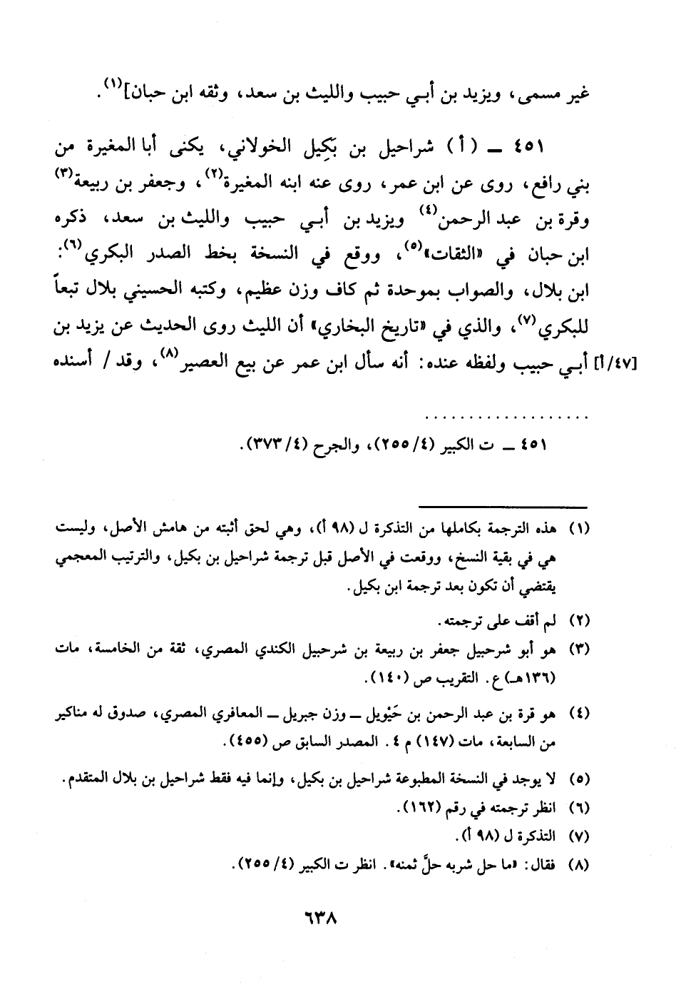 451 - اشرَاحِيل بن بكيل الْخَولَانِيّ يكنى أَبَا الْمُغيرَة من بنى رَافع روى عَن بن عمر روى عَنهُ ابْنه الْمُغيرَة وجعفر بن ربيعَة وقرة بن عبد الرَّحْمَن وَيزِيد بن أبي حبيب وَاللَّيْث بن سعد ذكره بن حبَان فِي الثِّقَات وَوَقع فِي النُّسْخَة بِخَط الصَّدْر الْبكْرِيّ بن بِلَال وَالصَّوَاب بموحدة ثمَّ كَاف وزن عَظِيم وَكتبه الْحُسَيْنِي بِلَال تبعا للبكري وَالَّذِي فِي تَارِيخ البُخَارِيّ أَن اللَّيْث روى الحَدِيث عَن يزِيد بن أبي حبيب وَلَفظه عِنْده أَنه سَأَلَ بن عمر عَن بيع الْعصير وَقد اسنده